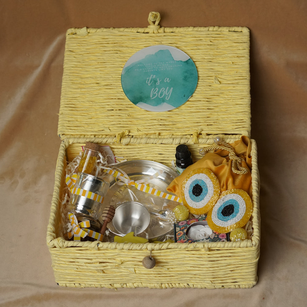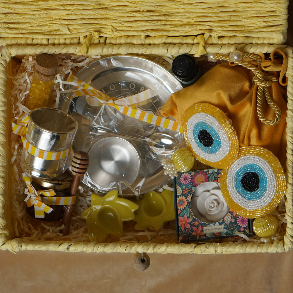 Presenting our exclusive gifting hamper, curated as the ultimate kids hamper for newborns and toddlers. This stunning Silver article features a complete dining set for your little one, beautifully accented with the sacred evileye theme to protect them from all harm.