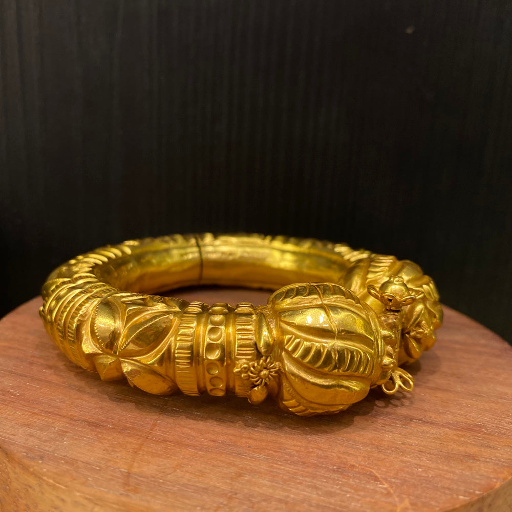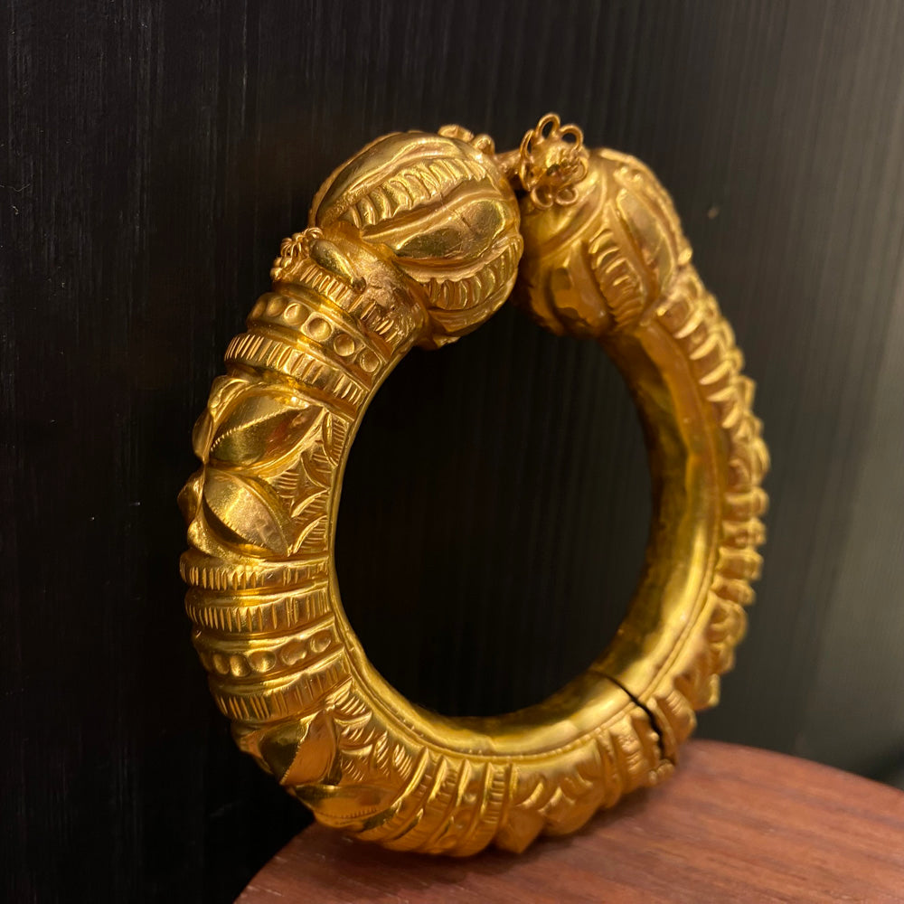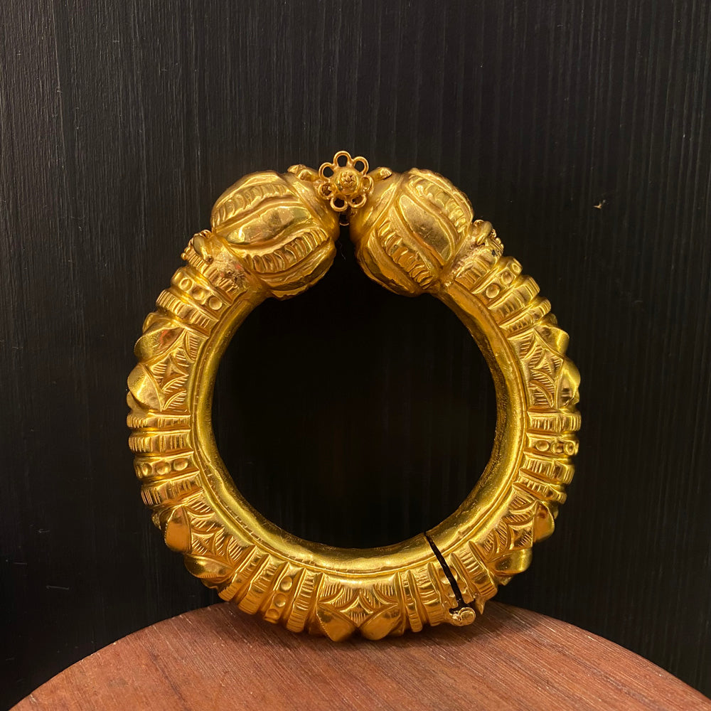 This piece masterfully blends a rich gold tone with the cool, substantial feel of a solid silver bangle, crafted in the traditional form of a silver kada. It is a true vintage bangle, designed as a heritage kada that carries a profound sense of history. Every curve and detail is imbued with an undeniable old-world charm, offering a timeless statement that connects the wearer to a legacy of artistry and enduring style.