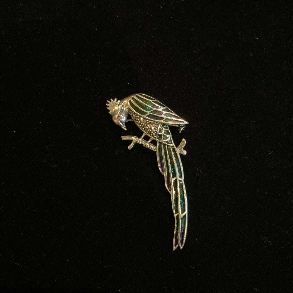 This exquisite silver brooch showcases the captivating beauty of a meticulously detailed parrot motif, a true testament to masterful craftsmanship. The vibrant form of the bird is brought to life with traditional Meenakari enamel work, where brilliant colors are artfully filled into intricate engraved patterns. Accents of gleaming semi-precious stones add further dimension and a touch of natural sparkle to the elaborate design. A celebration of artisanal skill and vivid artistry, this piece is designed to be a joyful and sophisticated statement accessory for any occasion.
