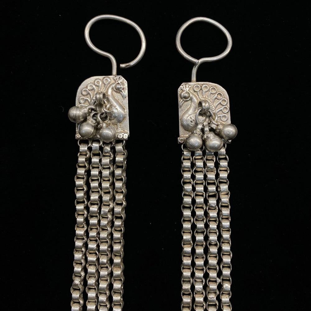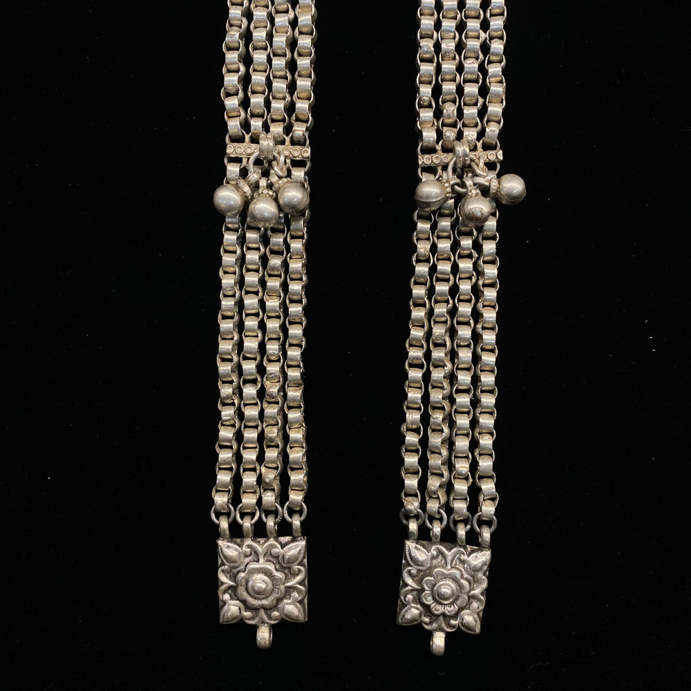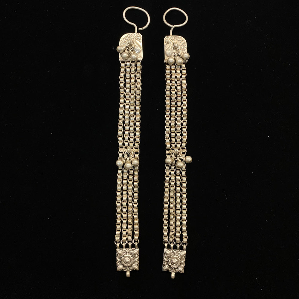 This silver kaanchain features a graceful peacock motif and is designed as a layered chain that creates a rich, textured look. It is delicately adorned with tiny ghungroo bells that add a soft, melodic chime. This combination of natural symbolism and whimsical detail makes it a distinctive piece of boho jewellery, perfect for a free-spirited and artistic style.