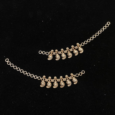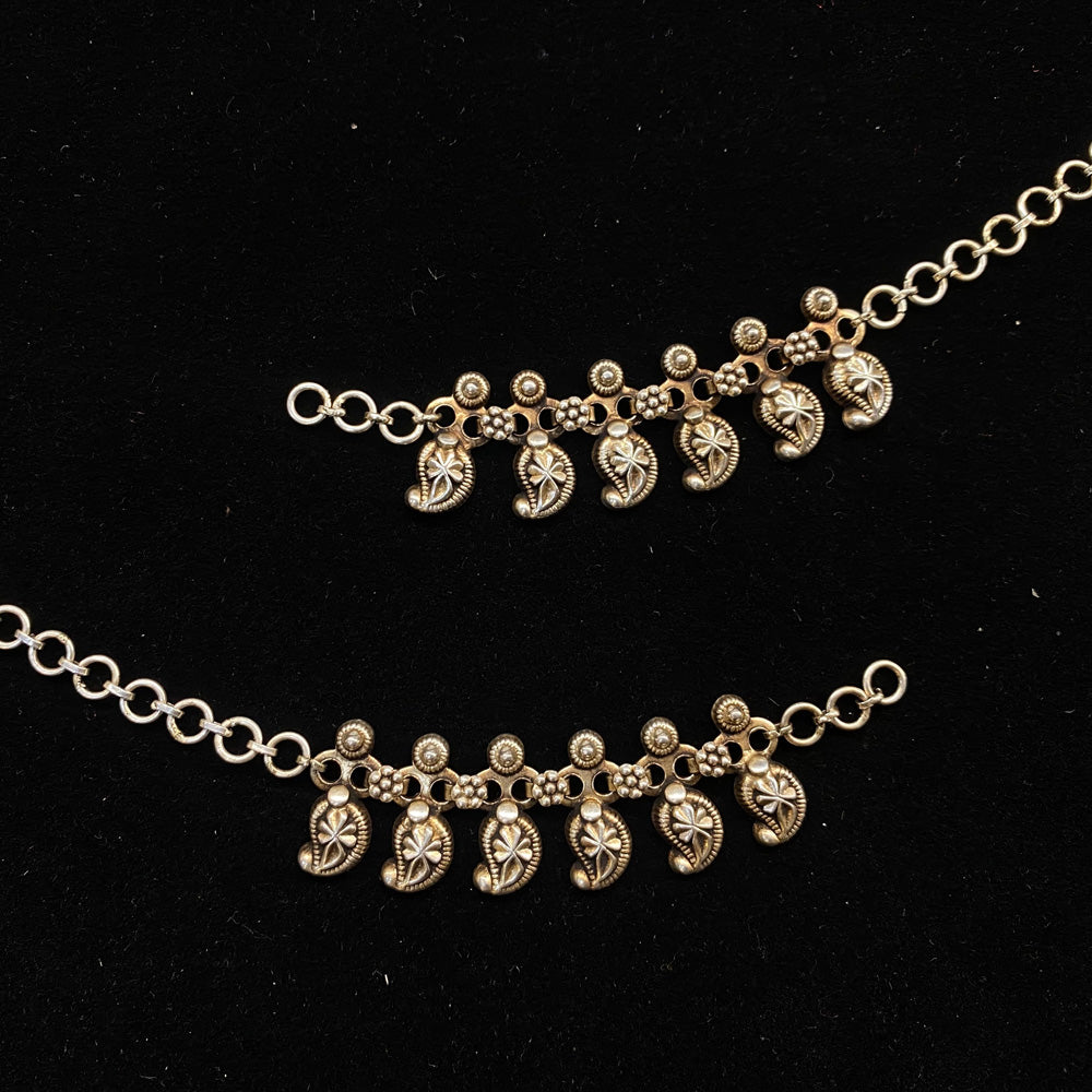 This silver kaanchain is meticulously crafted with intricate heritage motifs, drawing from traditional patterns and symbolic artistry. Its elaborate design evokes a deep sense of old-world charm, making it a true piece of vintage jewellery that carries the weight and beauty of timeless tradition.