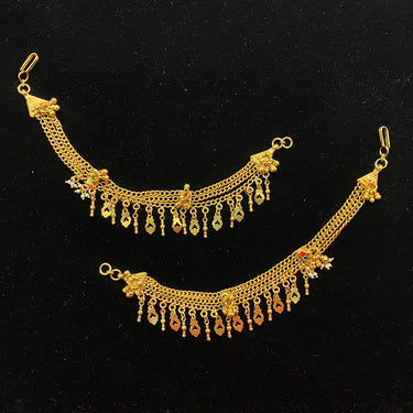 This eye-catching kaanchain showcases a dual-tone design, masterfully blending silver with a contrasting metallic hue. It is constructed as a layered piece, featuring multiple chains of varying lengths and intricate link patterns that create a rich, textured look. The design is completed with delicate tassels that add movement and softness. With its bold geometric elements and symbolic motifs, the piece embraces a strong tribal aesthetic for a truly statement-making accessory.Disclaimer: All Handcrafted Products Are Imperfectly Perfect.