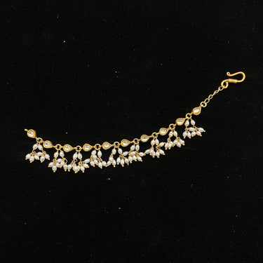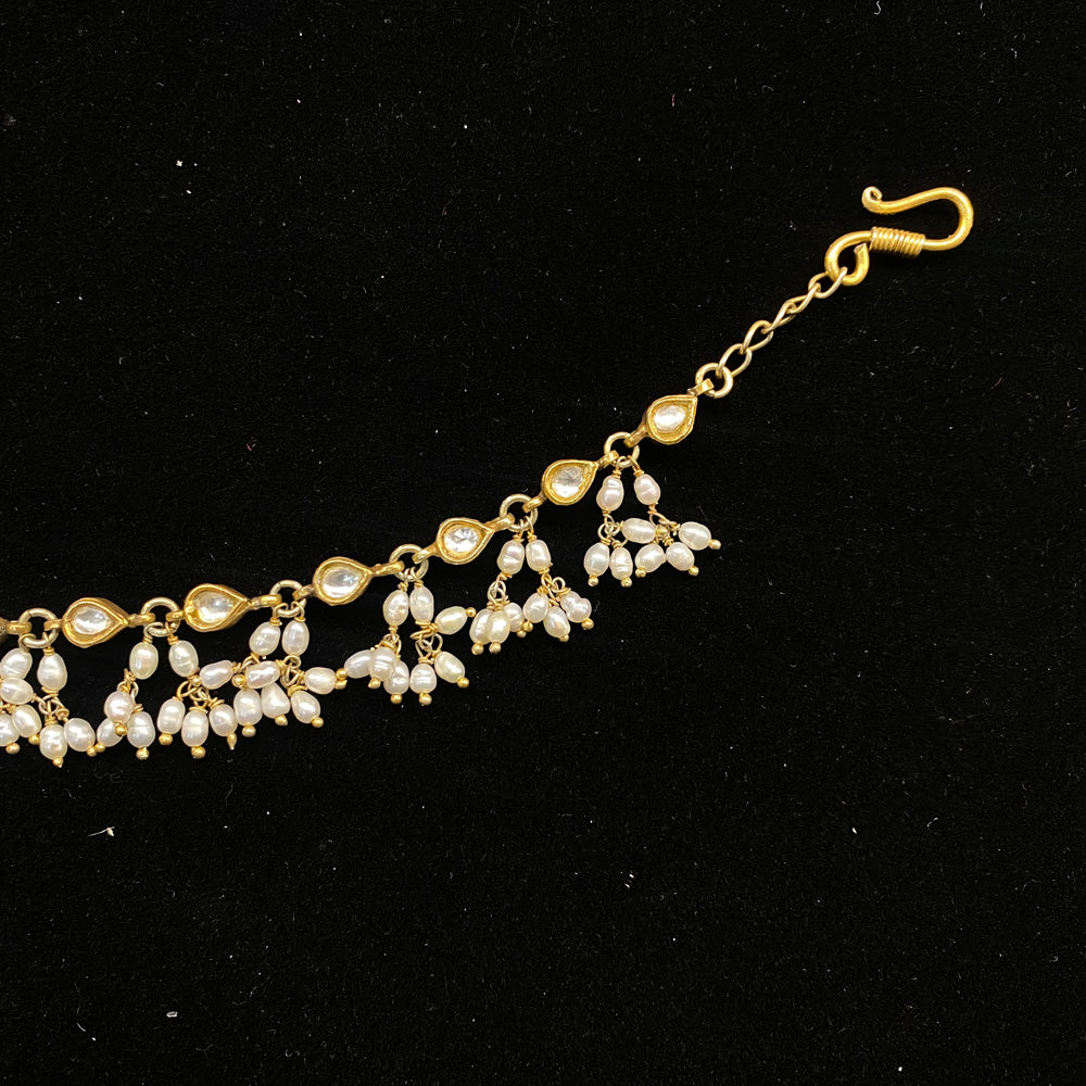 This kaanchain beautifully blends a warm gold tone with cool silver in a dual-metal design. It is richly adorned with sparkling kundan stones and luminous freshwater pearls. The piece is completed with delicate tassels that add graceful movement, embodying the intricate elegance of heritage design.
