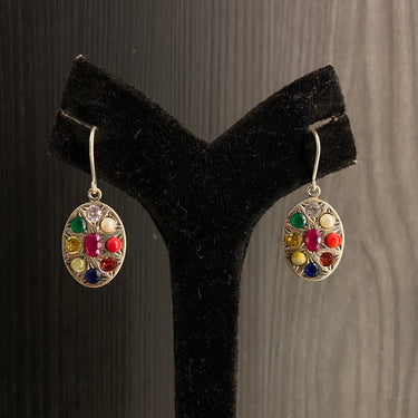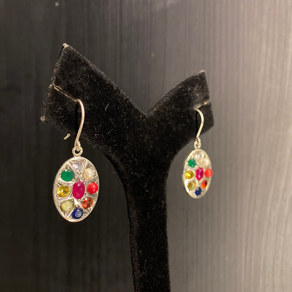 These minimalist jewellery earrings, crafted from polished silver, are defined by their serene and sophisticated design. Each piece features a single, smooth navratna stone, harmoniously combining nine sacred semi-precious gems into a unified cabochon that offers a subtle, spiritual pop of color. Their understated elegance makes them a versatile accessory, perfectly complementing everything from a crisp linen kurta to a simple silk saree for a touch of everyday grace.All Handcrafted Products Are Imperfectly Perfect.