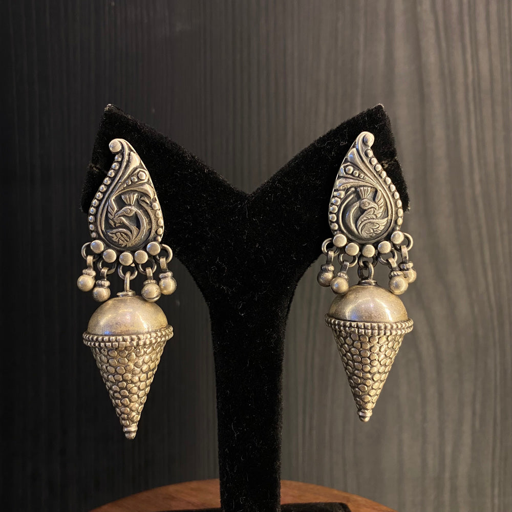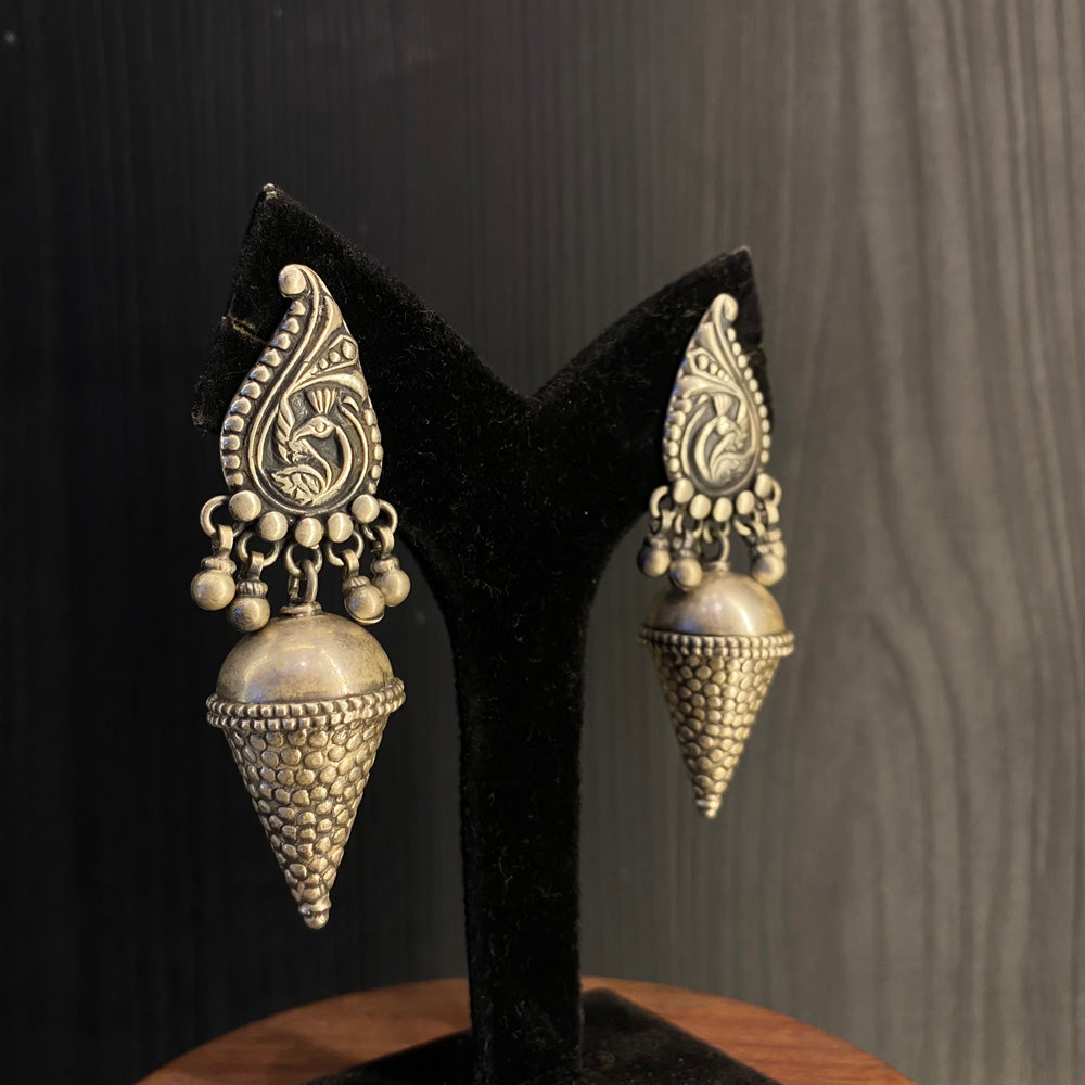 These striking tribal jewellery pieces are crafted entirely in silver, merging a bold cone-shaped motif with the majestic beauty of a peacock motif. Etched with intricate feather-like details, the conical form is elegantly suspended with a cascade of tiny silver ghungroos that chime softly with every movement. For a look that is both powerful and poetic, pair these earrings with a simple handwoven black saree or an earthy, block-printed lehenga, allowing their sculptural silhouette and gentle music to create an unforgettable impression. All Handcrafted Products Are Imperfectly Perfect.