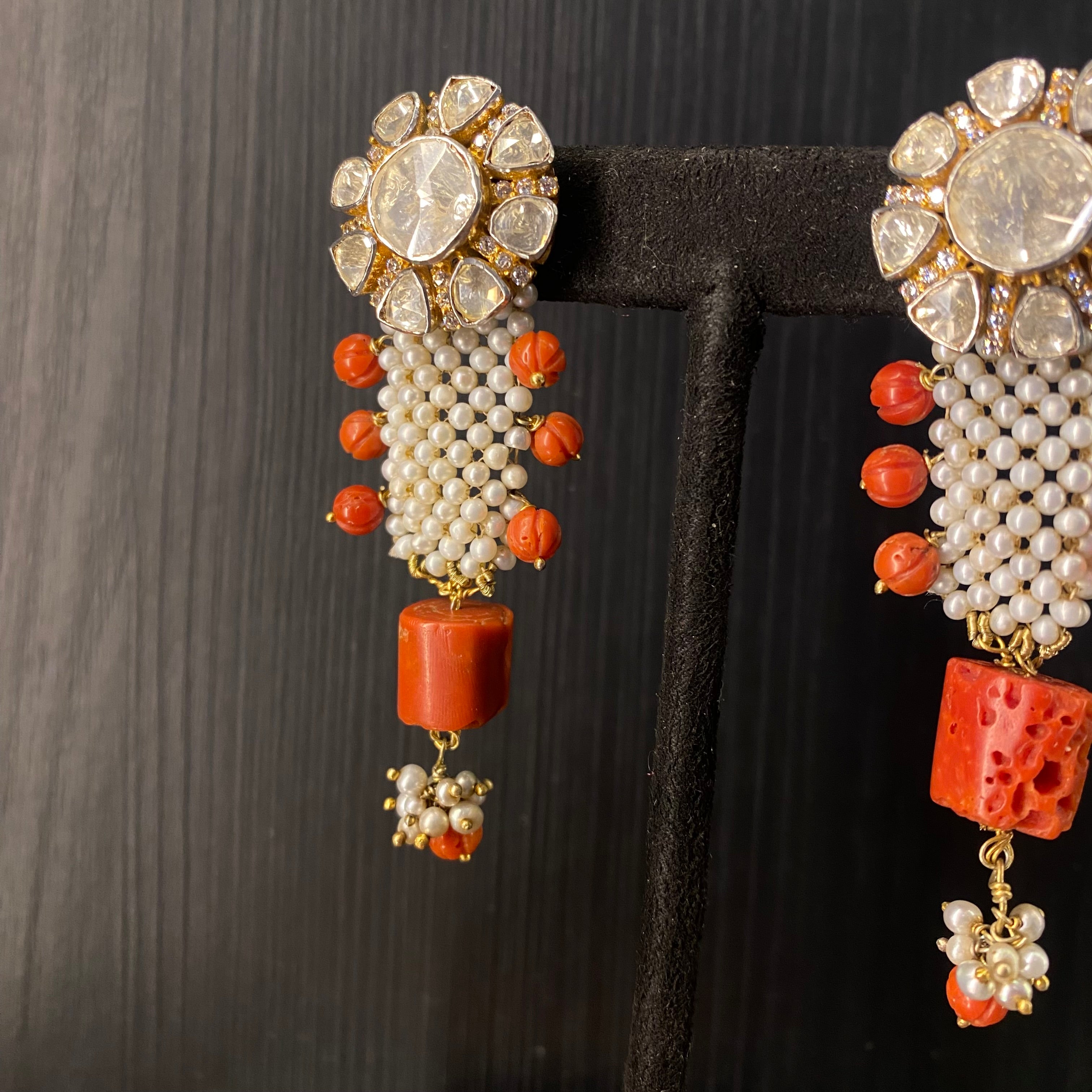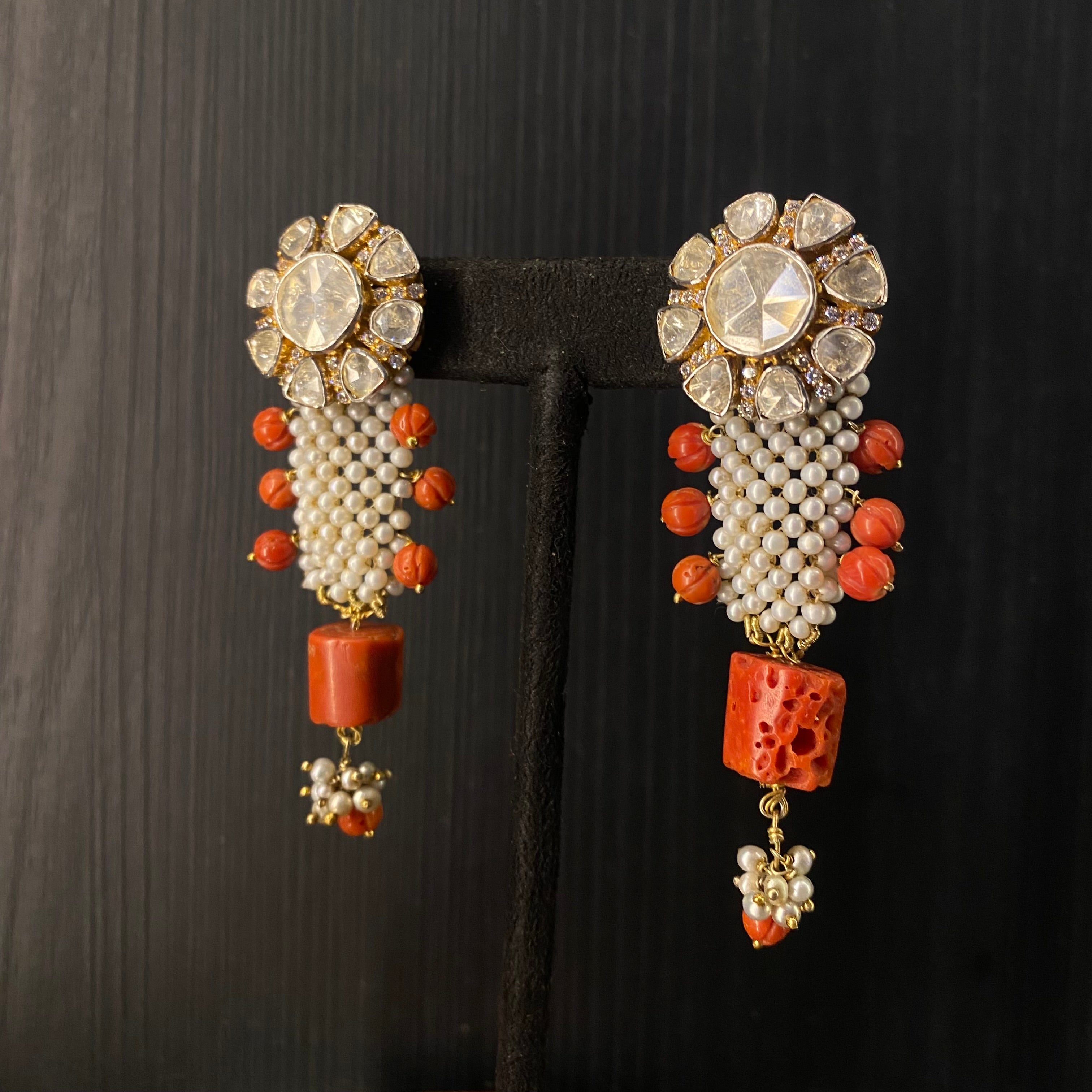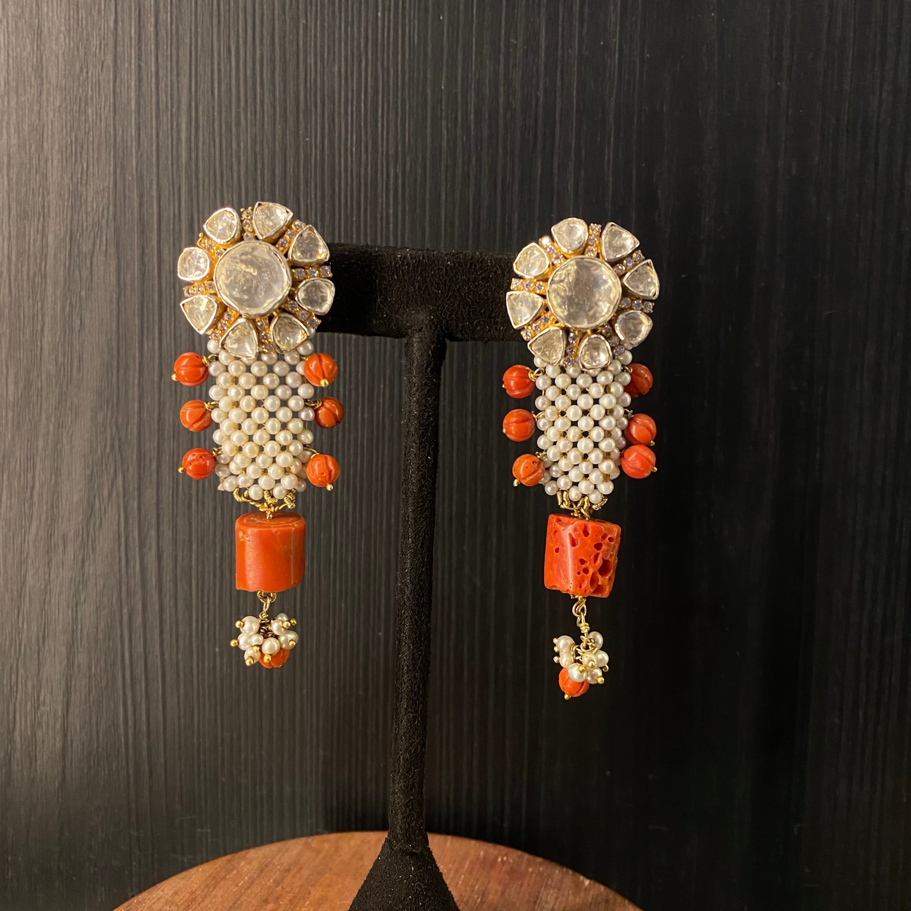 These gold tone earrings are a vibrant fusion of intricate craftsmanship and tribal spirit. They feature a bold floral motif, meticulously set with radiant kundan that forms the central focus. The design is enriched with the organic, fiery hue of corals and accented by the soft glow of freshwater pearls, creating a striking contrast of texture and color. This harmonious blend of opulent materials and symbolic artistry results in a pair of tribal earrings that make a confident and unforgettable statement.