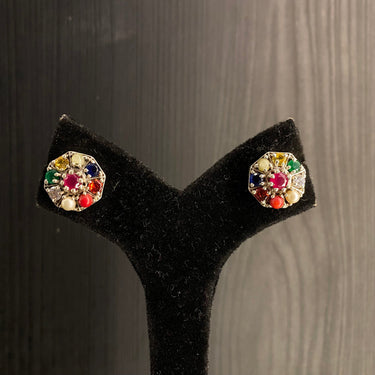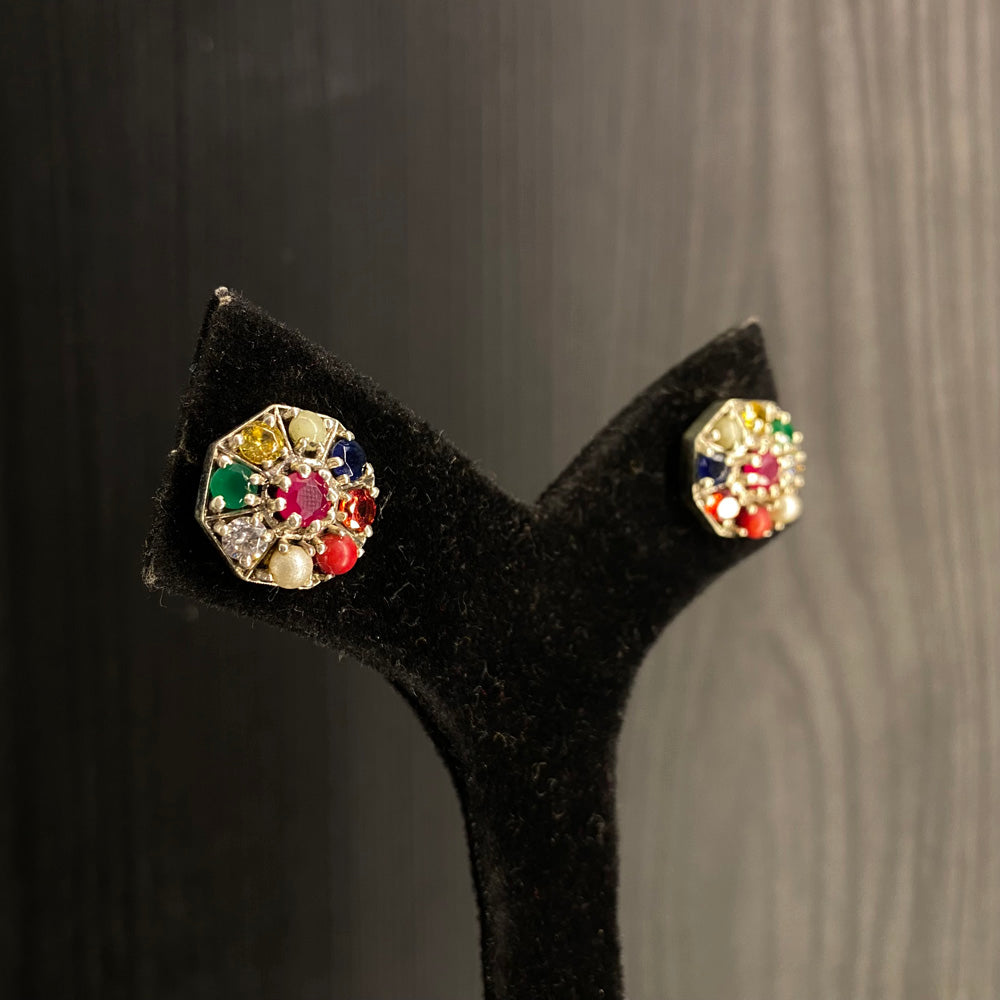 These minimalist jewellery pieces are the epitome of understated elegance, taking the form of sleek silver studs. Crafted from polished silver, each stud is centered with a single, smooth navratna stone that harmoniously blends nine sacred semi-precious gems into one unified cabochon. Their serene design makes them a versatile accessory, effortlessly adding a touch of spiritual sophistication to a crisp linen kurta or a simple silk saree for a look of quiet intention and refined grace.All Handcrafted Products Are Imperfectly Perfect.