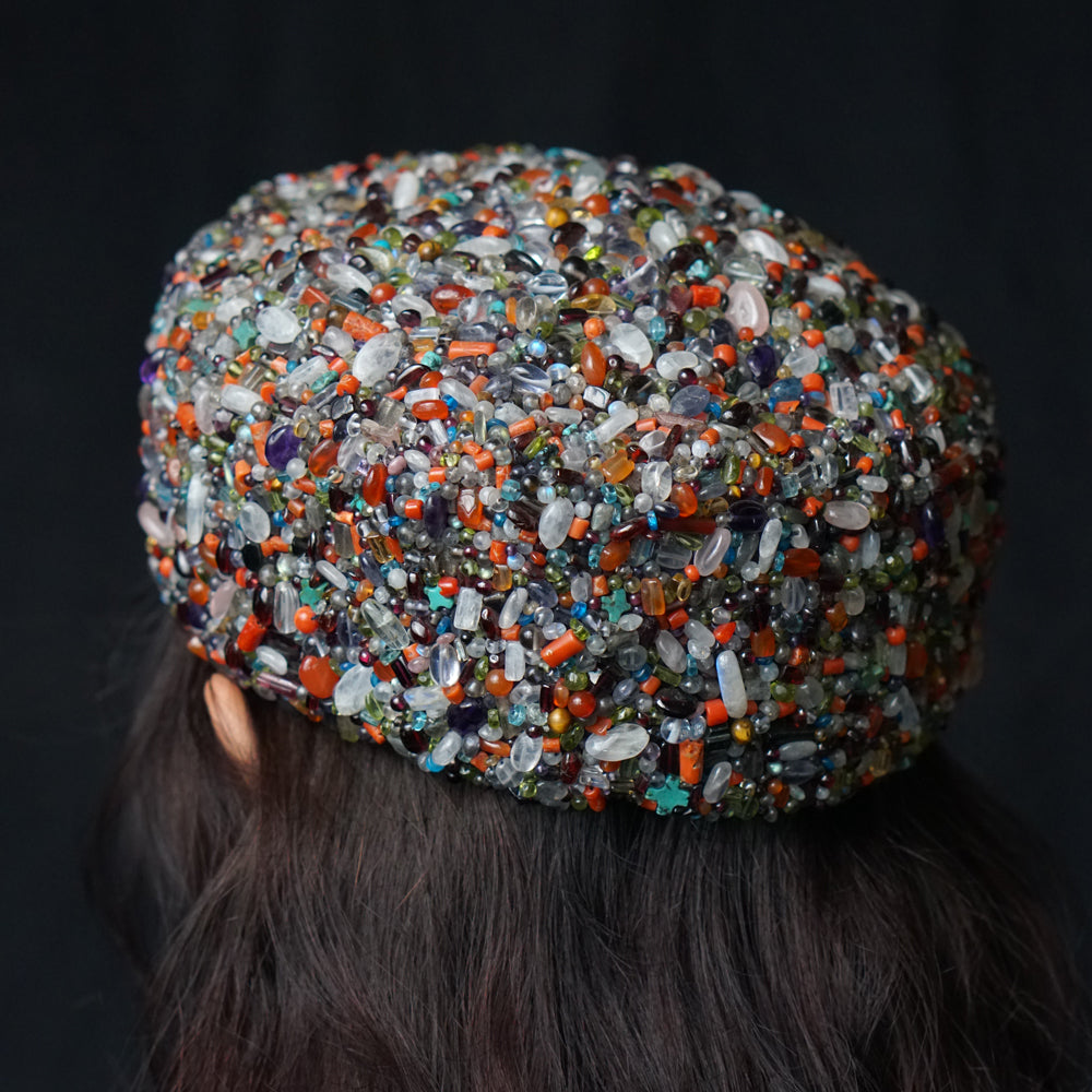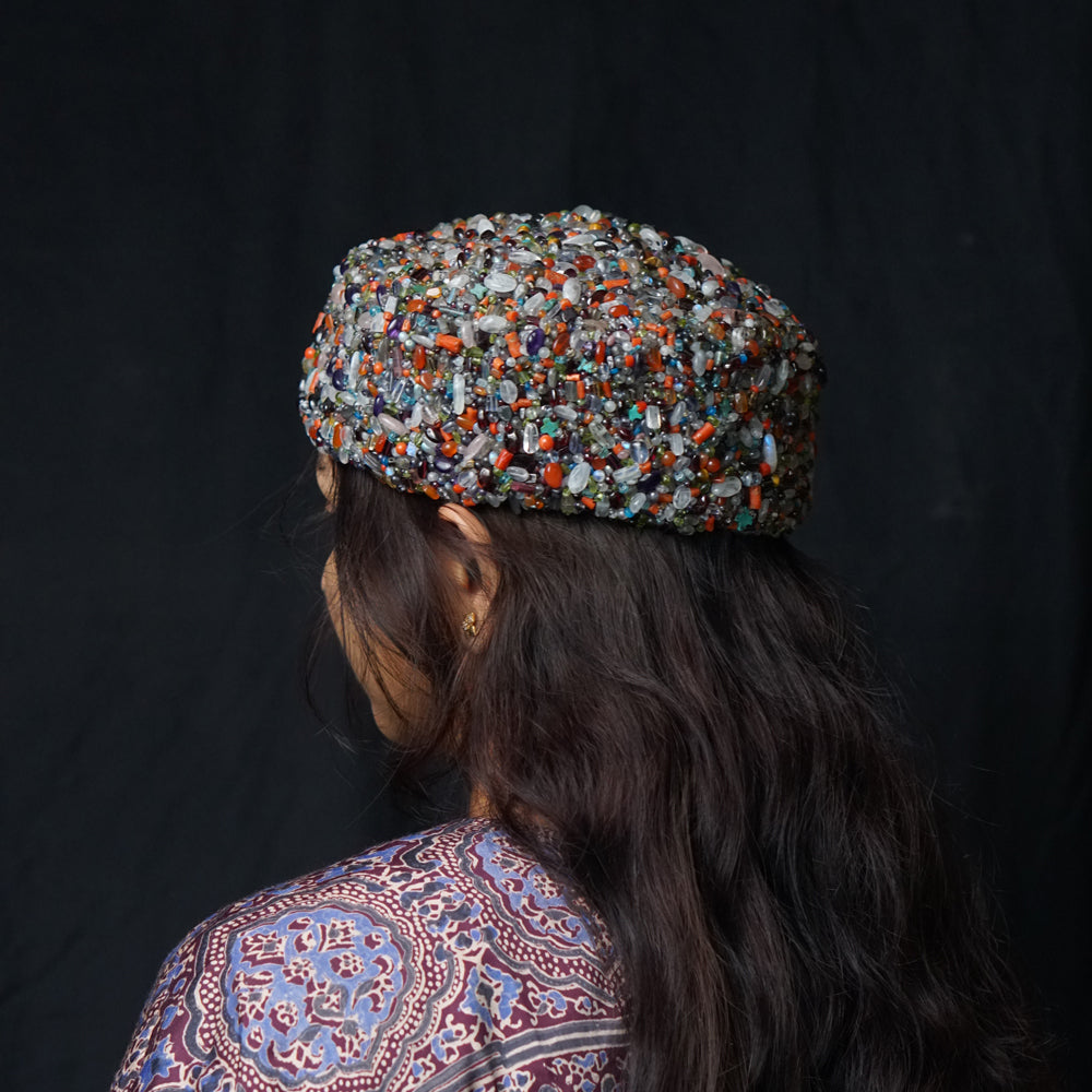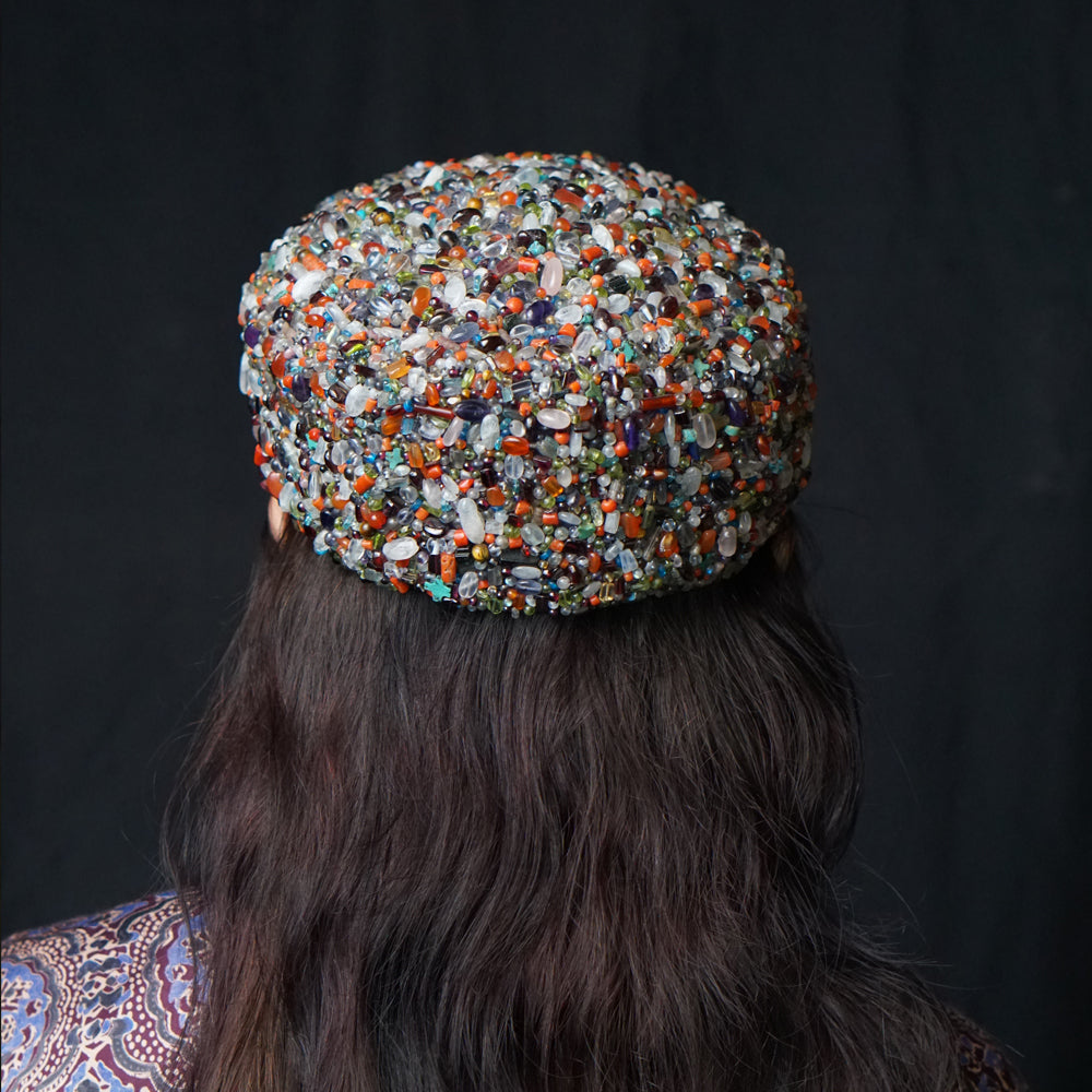 The elegant yet stylish stone-studded traditional cap, also known as the Kashmiri Topi, is a true heritage piece. Adorned with corals, amethyst, onyx, crystals, lapis, and an array of other semi-precious stones, it is intricately crafted in a clustered stone setting. Worn as a part of Kashmiri tradition, this cap beautifully blends cultural significance with timeless elegance, making it a statement of both style and heritage. All Handcrafted Products Are Imperfectly Perfect.