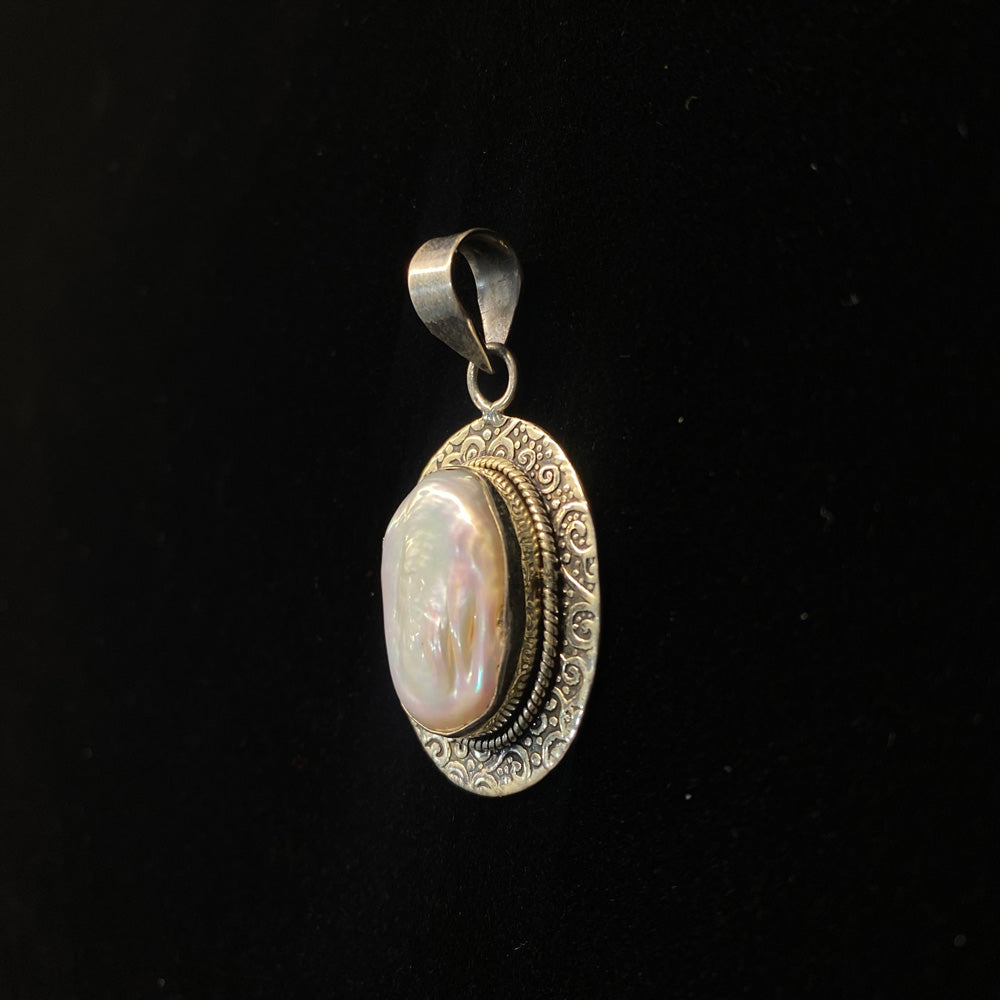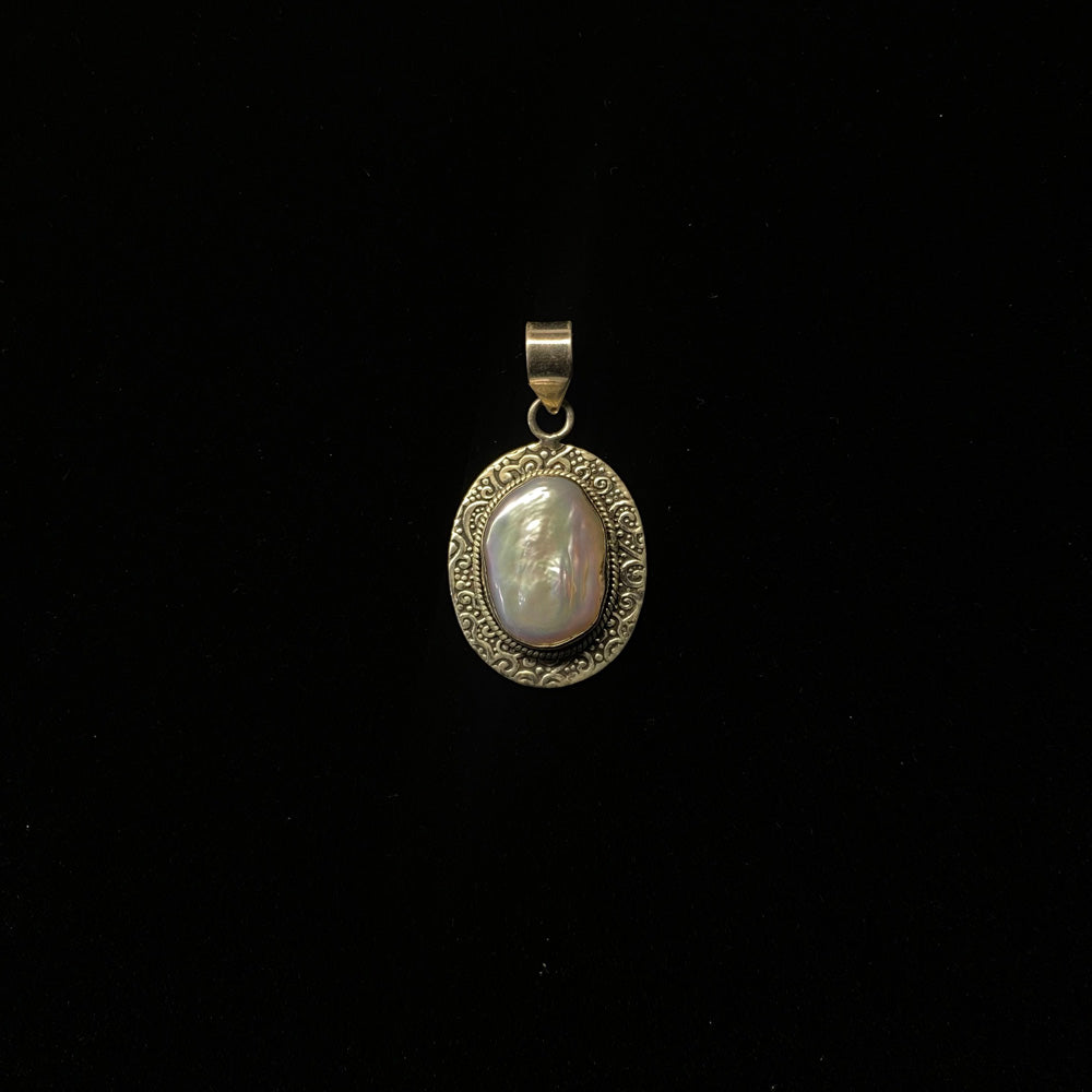 This minimal pendant embodies quiet sophistication. Crafted from cool, polished silver, its clean and understated form serves as the perfect canvas for a single, luminous inlay of mother of pearl. The soft, iridescent glow of the shell against the simple silver creates a serene and timeless statement, celebrating elegance in its most refined and essential form.