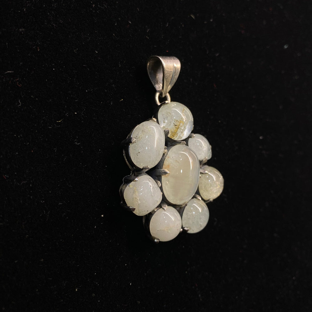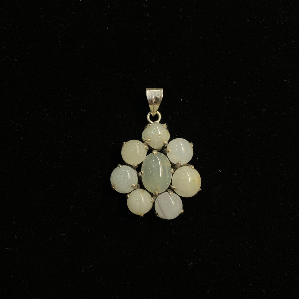 This boho design pendant is crafted in silver and centers on an intricate floral motif. A polished semi-precious stone is nestled within the design, adding a touch of earthy color to this free-spirited silver pendant.