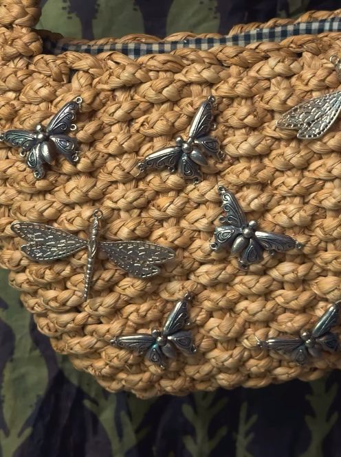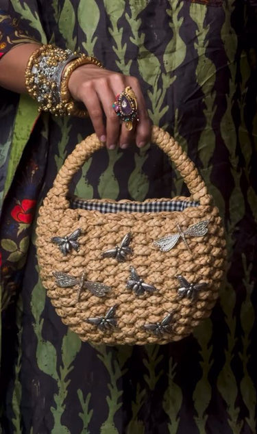 Crafted with mesmerizing skill, this quirky structured bag is finely woven from jute threads, where every deliberate thread and intricate knot converges to form captivating patterns. The artistry embedded in its construction is truly hypnotic. Adorned with studded dragonfly and butterfly motifs, each one designed with breathtaking detail and precision, these embellishments seem to spring to life, creating a world of their own right upon the bag. Effortlessly versatile, it is the perfect companion to elevate any ensemble, be it an elegant indowestern fusion or a sleek western outfit, ensuring you make a bold and unforgettable statement on every occasion. A testament to sustainable style and artisanal passion, this piece isn’t just an accessory; it’s a wearable masterpiece that carries a story in every weave. Disclaimer: All Handcrafted Products Are Imperfectly Perfect.