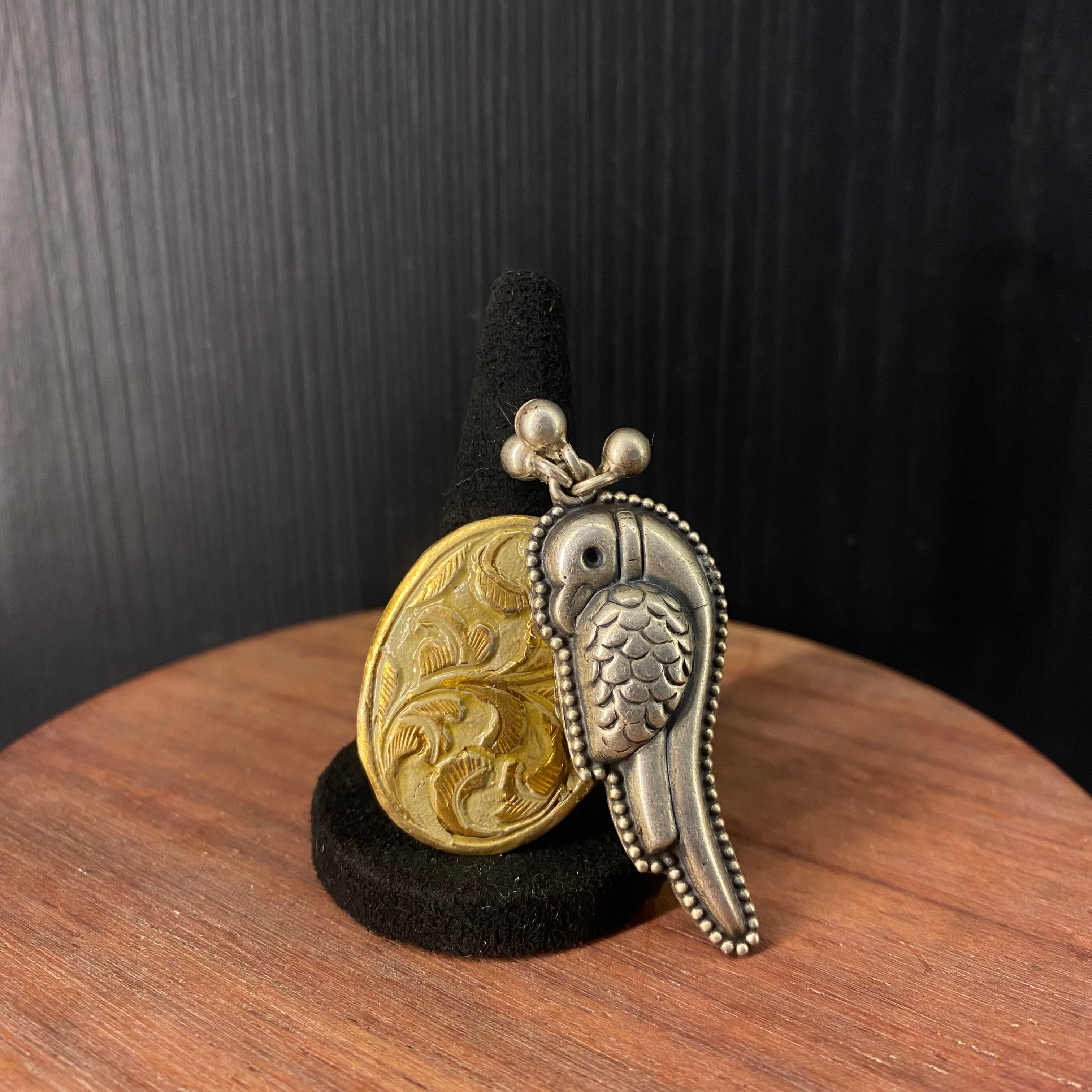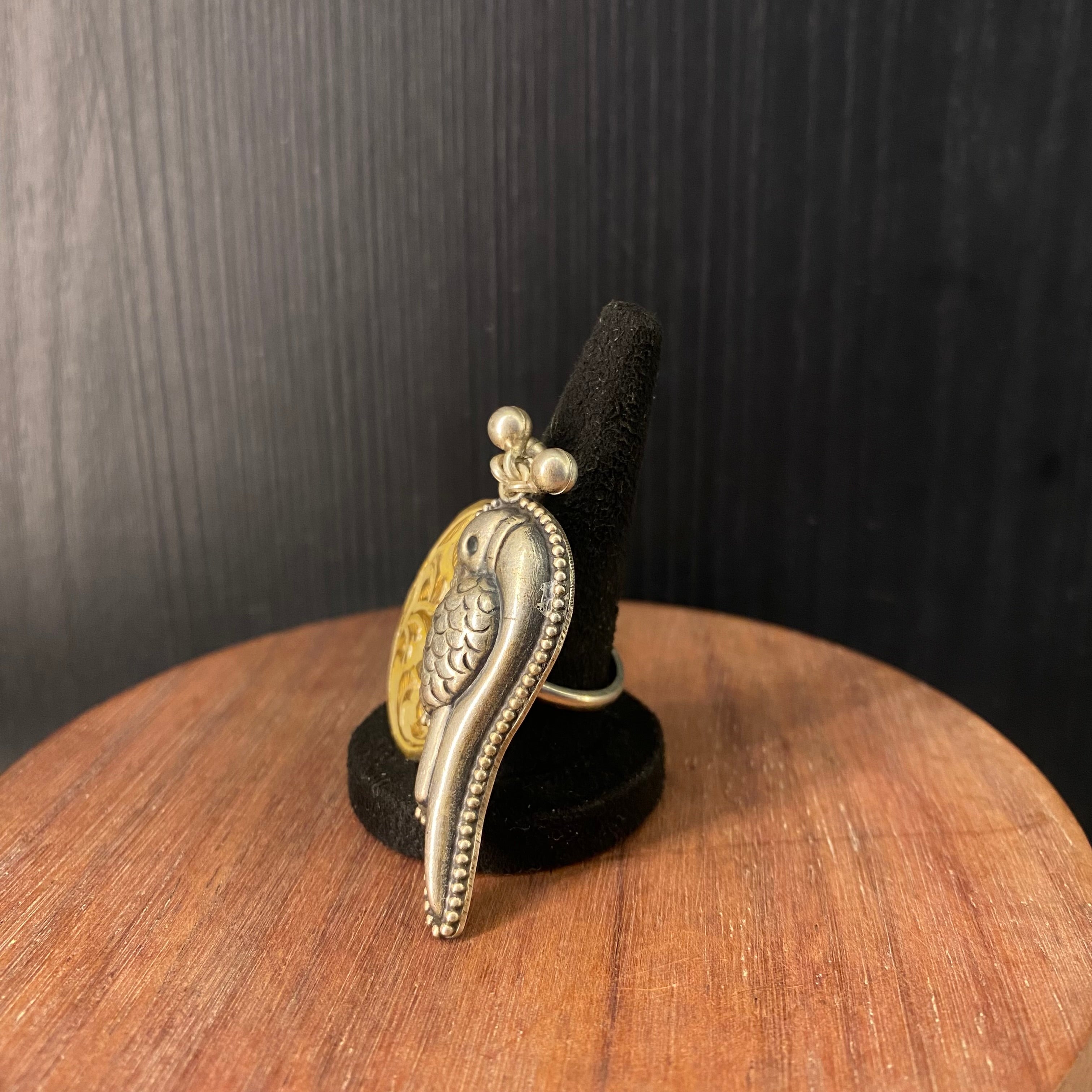 This distinctive silver ring is a bold expression of tribal artistry, centered on a meticulously carved semi-precious stone featuring a vibrant parrot motif. The playful and symbolic bird is brought to life through detailed carving, set within a substantial silver band. Adding an element of whimsy and sound, a tiny ghungroo bell is delicately incorporated, creating a subtle chime with every movement. This combination of intricate carving, symbolic design, and melodic detail makes for a truly unique and spirited tribal ring.
