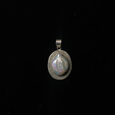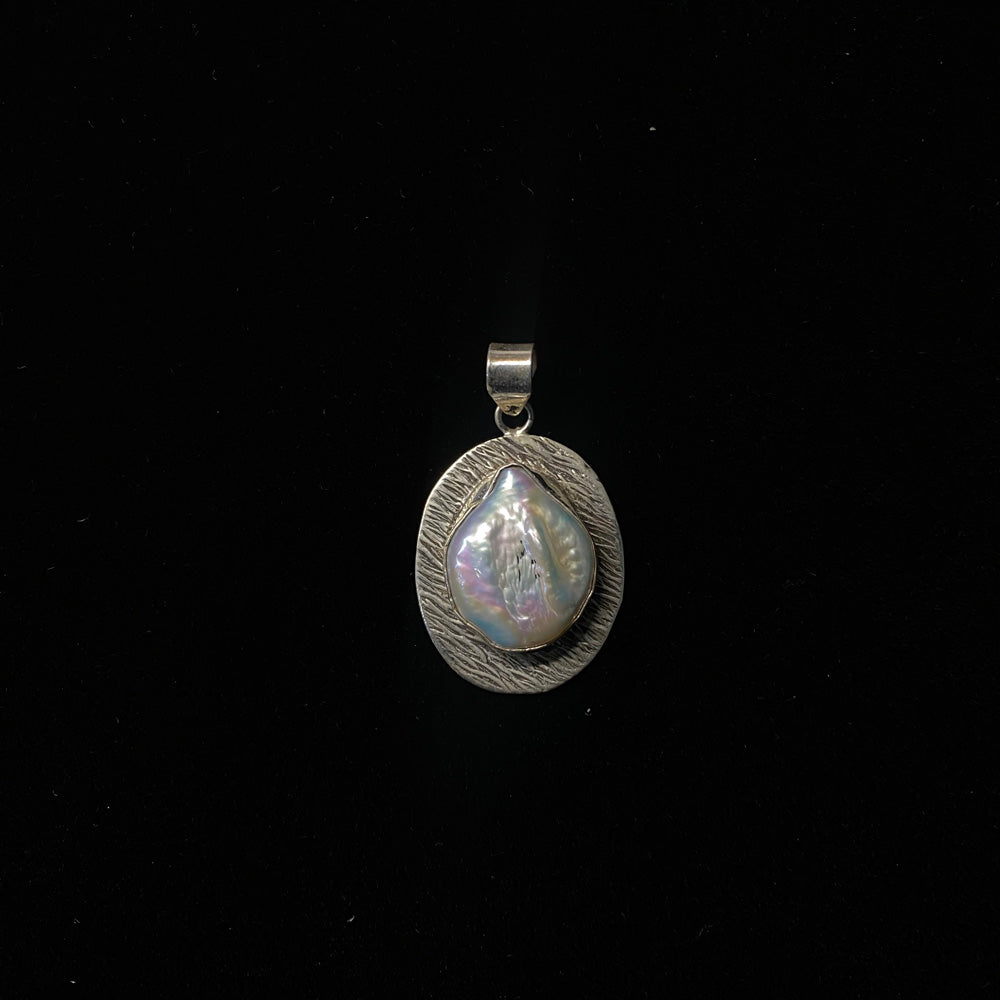 This minimal pendant is a breath of serene elegance. Crafted from cool, polished silver, its clean and understated form is designed to showcase a single, luminous inlay of mother of pearl. The soft, ethereal glow of the shell against the simple silver creates a timeless and sophisticated statement, celebrating the quiet power of refined, essential beauty.