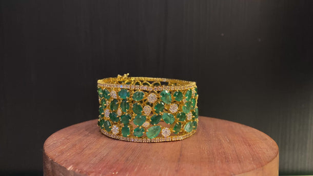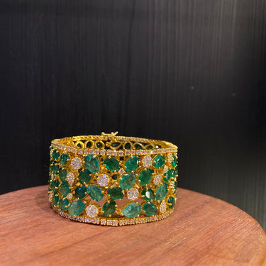 A true jewel fit for royalty, this exquisite gold bracelet is an heirloom in the making. Each facet tells a story of elegance, where the deep, mesmerizing green of pristine emeralds meets the brilliant, fiery sparkle of diamonds. Set in lustrous gold, the piece is a harmonious dance of color and light—a bold statement of sophistication that commands attention and awe. More than an accessory, it is a treasure that transforms any ensemble with an air of timeless grace and regal power. For the moments that demand nothing less than magnificent.
