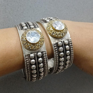This dual tone silver bangle, crafted in the bold style of a silver kada, is a striking example of heritage jewellery. Inspired by tribal design, it carries raw elegance while being adorned with carefully set semi-precious stones that add subtle vibrance. A perfect fusion of tradition and artistry, this piece is both versatile and timeless.Disclaimer: All Handcrafted Products Are Imperfectly Perfect.