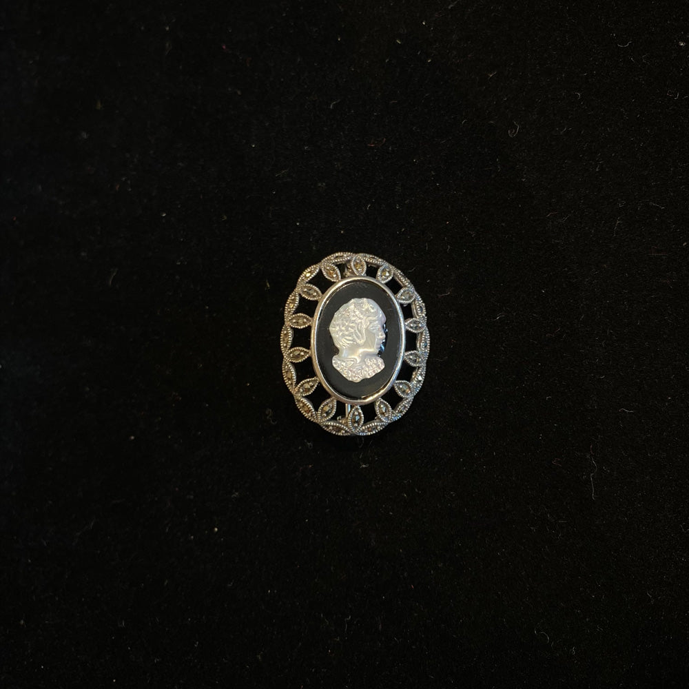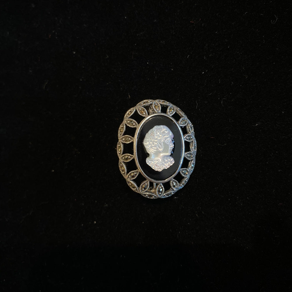 Crafted in gleaming silver, this stunning brooch captures the essence of Victorian elegance with its intricately detailed motif. The design is richly adorned with the soft, iridescent glow of mother of pearl, providing a luminous base, while bold accents of deep black onyx add striking contrast and depth. This piece is a harmonious blend of classic opulence and timeless artistry, designed to elevate any outfit with a touch of historical grandeur and sophisticated charm. It is more than an accessory; it is a wearable heirloom that connects the past to the present.