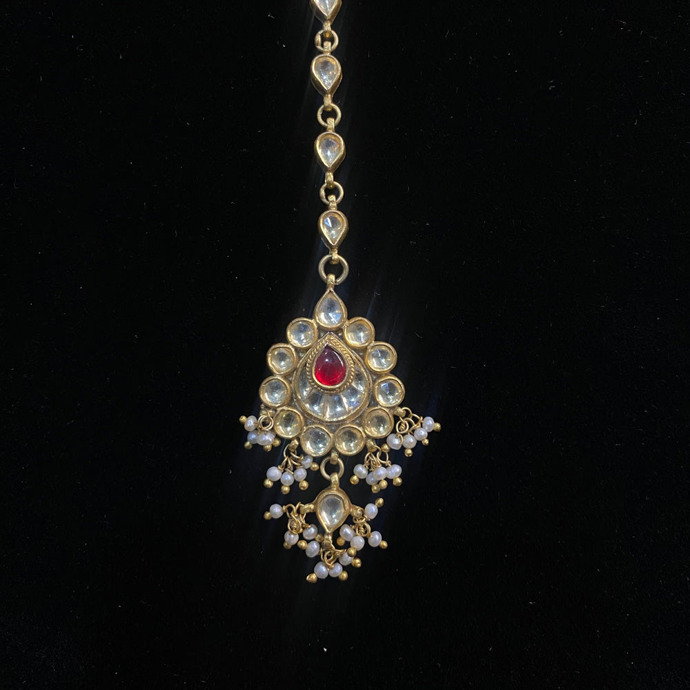 A piece of majestic elegance, this royal mangtika is a testament to refined artistry. The silver base of the ornament is beautifully enhanced with a warm gold tone, creating a rich foundation for its intricate design. At the center, an elaborate floral motif comes to life through the radiant glow of kundan, each polished gem set with precision. Dotted amongst the gleaming stones are lustrous freshwater pearls, their soft, organic sheen providing a delicate contrast to the vibrant kundan work. This silver mangtika, with its harmonious blend of elements, is more than an accessory; it is a symbol of timeless grace and royal heritage.