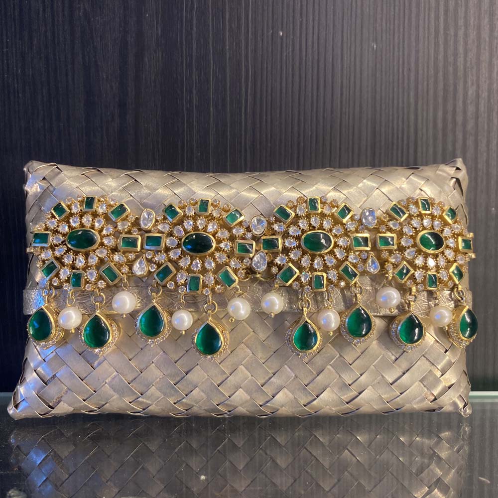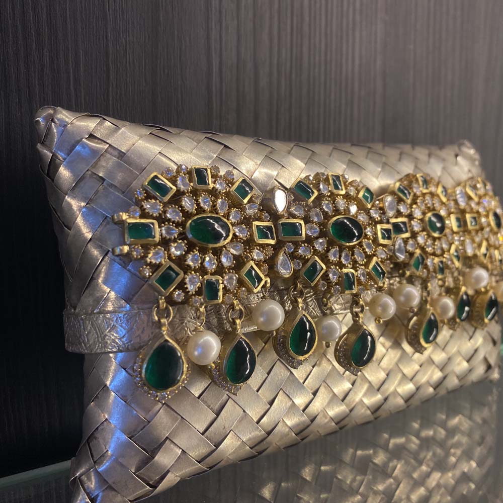 This dual tone silver purse is a finely crafted silver clutch that reflects the elegance of heritage luxury. Designed with intricate royal motifs, it is adorned with glowing emeralds, radiant kundan, and delicate pearls that add richness and sophistication. The refined silver weave gives the small purse its unique texture, making it both a functional accessory and a timeless piece of art.Disclaimer: All Handcrafted Products Are Imperfectly Perfect.