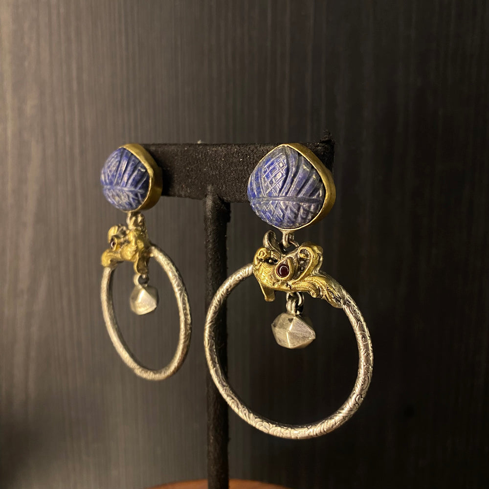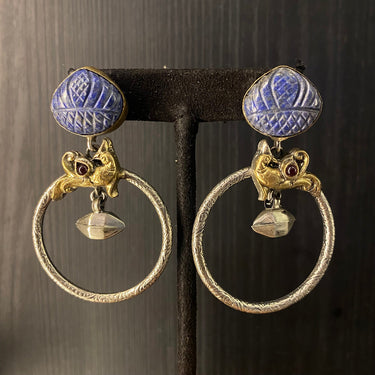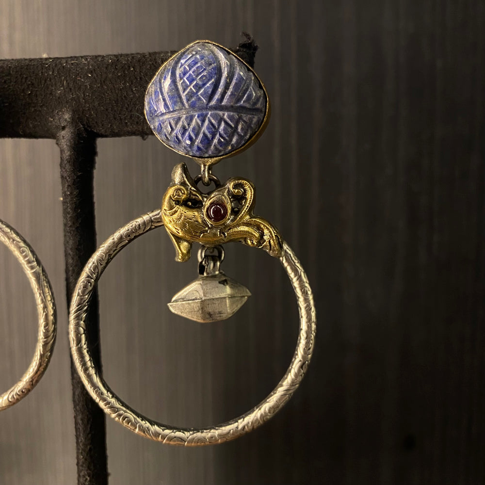 These bold tribal earrings feature a striking dual-tone design that blends silver with a contrasting metallic finish. Centered around a detailed peacock motif, the piece is highlighted with deep blue lapis stone, adding a rich and vibrant focal point. The combination of symbolic artistry and natural gemstone creates an accessory that is both powerful and elegantly rustic.