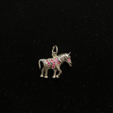 This detailed silver pendant captures the graceful form of a silver horse, its design accentuated by the subtle gleam of a semi-precious stone. The combination creates a piece of jewelry that embodies both movement and natural elegance.