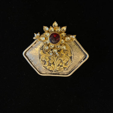 This exquisite dual-tone brooch is a beautiful dialogue between heritage and artistry, where bold tribal motifs intertwine with delicate floral patterns. The design is lavishly adorned with the regal sparkle of kundan and the soft, organic luster of freshwater pearls, creating a rich tapestry of texture and light. A true celebration of traditional craftsmanship, this piece bridges timeless elegance with contemporary statement, making it a versatile heirloom accessory. It is designed to add a touch of cultural grandeur and artisanal sophistication to any ensemble, modern or traditional.