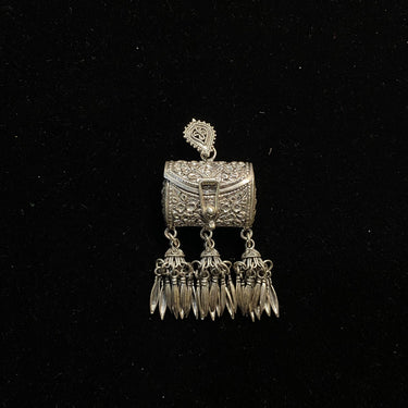 This unique pendant takes the charming form of a miniature purse, intricately crafted in silver. The silver purse features delicate floral carving and is finished with playful tassel charms, creating a wearable piece of detailed artistry.