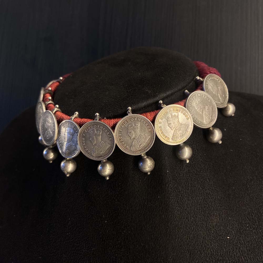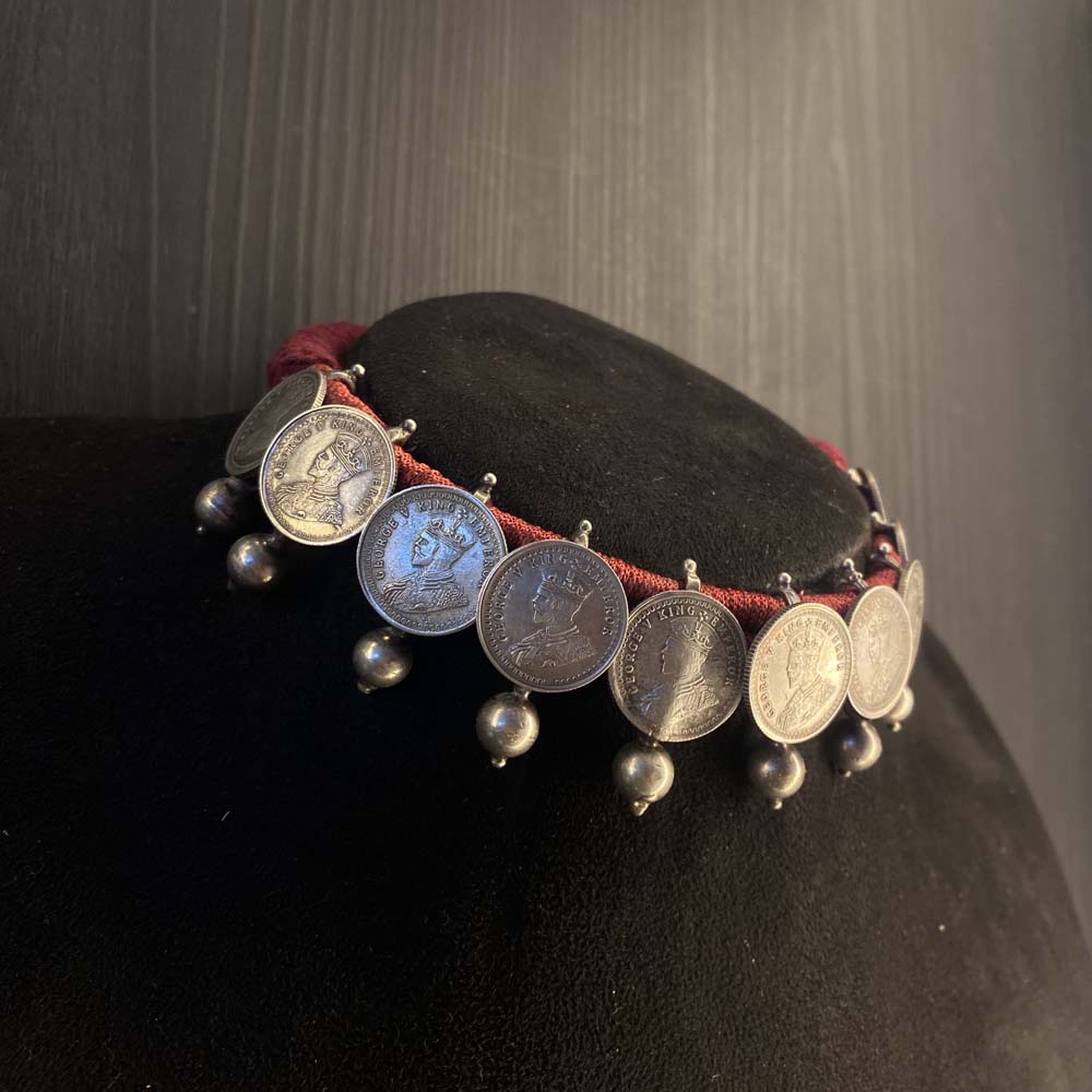 A masterpiece in silver, this silver choker reimagines the elegance of a coin choker with a touch of vintage necklace allure. Exuding old-world charm, it embodies the artistry of timeless craftsmanship while making a bold impression as statement jewellery. Perfect for those who seek to blend heritage with individuality, this piece transforms tradition into a striking contemporary treasure.Disclaimer: All Handcrafted Products Are Imperfectly Perfect.