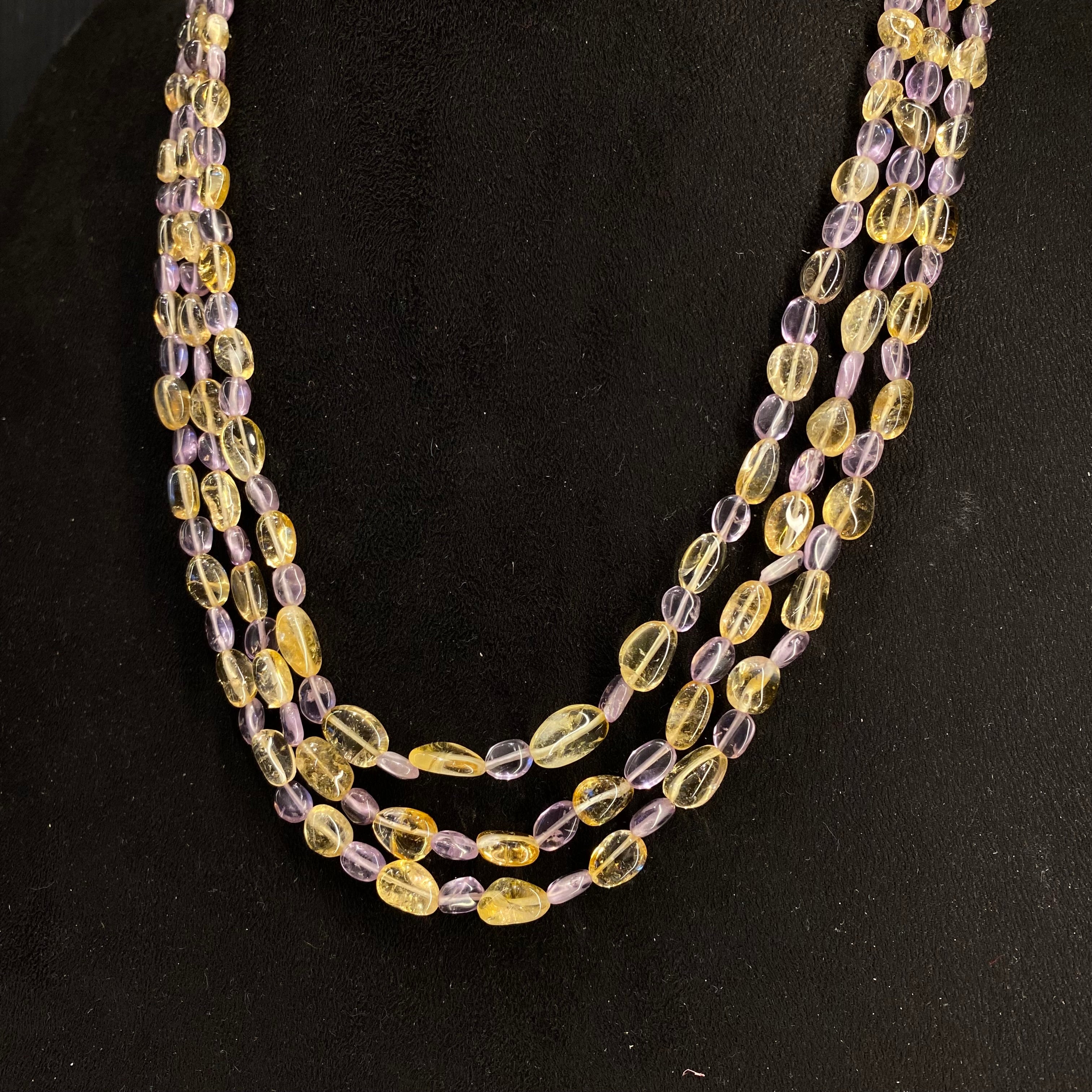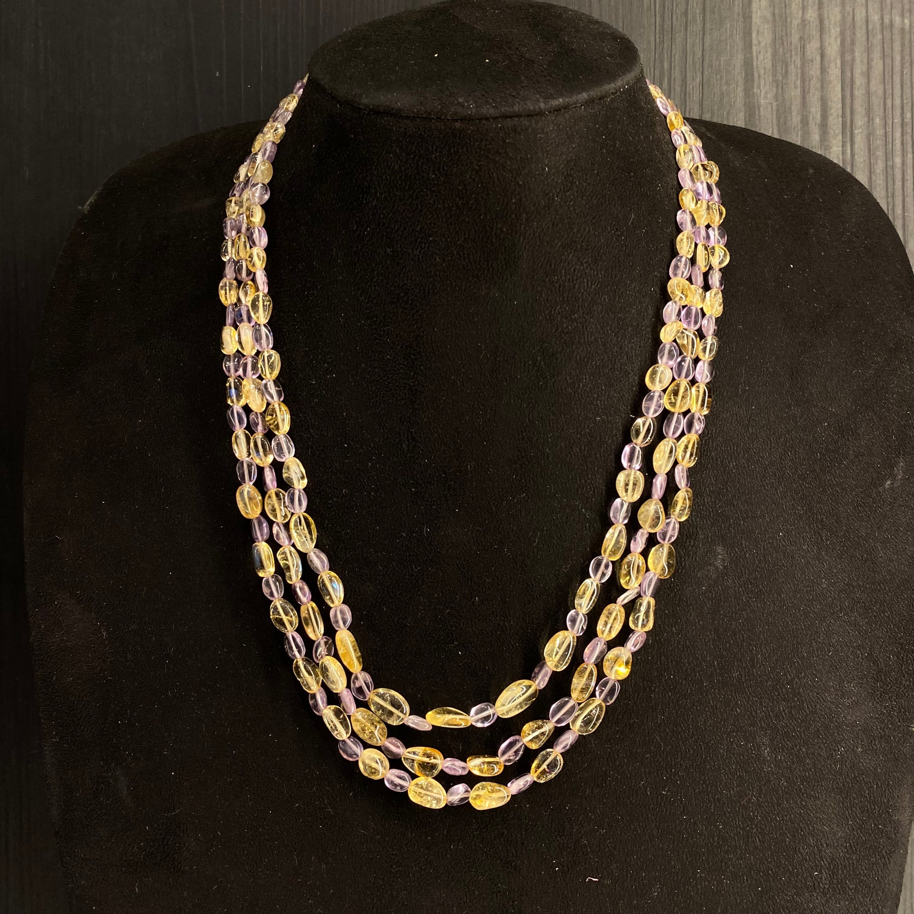 This royal mala is a masterpiece of layered luxury and chromatic harmony, standing as a definitive piece of royal jewellery. It is artfully composed of multiple strands, featuring the regal purple hues of amethyst beads intertwined with the warm, golden glow of citrine. The intentional layering of these powerful semi-precious stones creates a substantial and vibrant tapestry of color and texture. This opulent convergence results in a piece that is both a spiritually charged instrument and a commanding heirloom of majestic beauty.