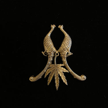 This exquisite silver brooch masterfully features not one, but two intricately detailed peacock motifs, their elegant forms captured in stunning relief. The majestic birds are beautifully framed and intertwined with delicate, trailing leaf motifs, creating a scene of natural grace and regal beauty. Meticulously handcrafted, every feather and curve is rendered with artisanal care, transforming sterling silver into a wearable work of art. Perfect for adding a touch of sophisticated splendor to any ensemble, this piece is a celebration of timeless craftsmanship and nature's artistry.
