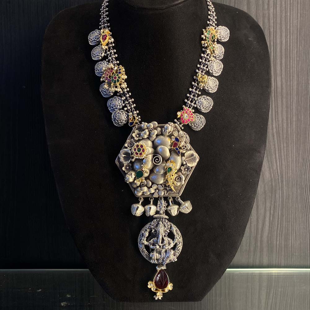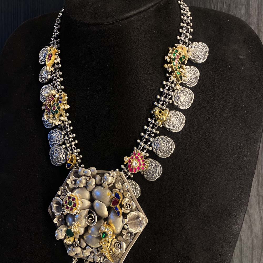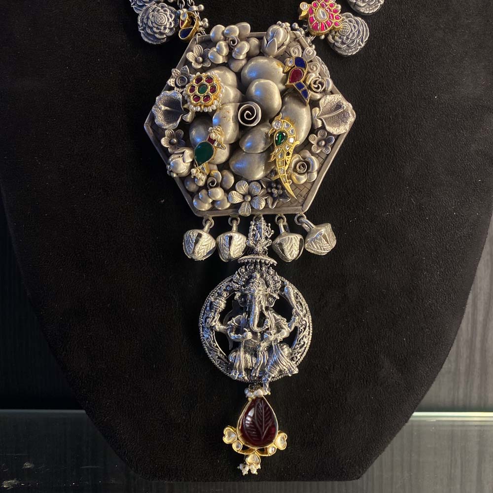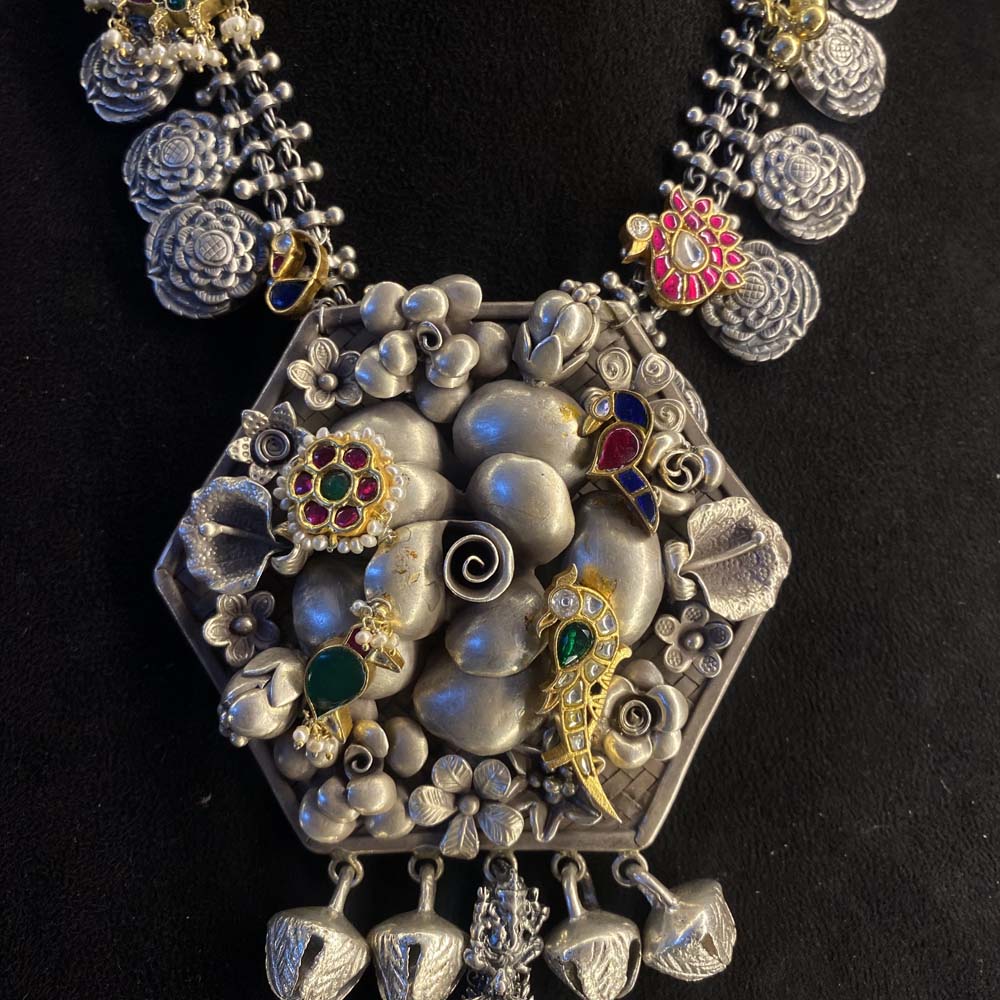 This dual tone silver necklace is a long necklace that celebrates the splendour of nature and divinity through timeless artistry. Featuring oversized florals and 3D flower detailing, it brings a sculptural elegance to traditional design. The piece is adorned with intricate floral, fish, parrot, peacock, and bird motifs, each symbolizing abundance, beauty, and grace. At its heart rests a striking Ganesha pendant, infusing the necklace with spiritual significance. A perfect balance of craftsmanship and creativity, this necklace is both a statement of heritage and a work of wearable art.Disclaimer: All Handcrafted Products Are Imperfectly Perfect.