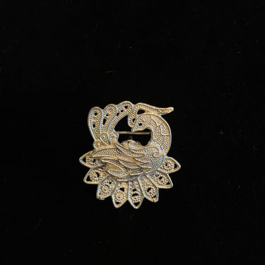 This stunning silver brooch is a masterful tribute to natural elegance, centered around an exquisitely carved and detailed peacock motif. Every feather, curve, and intricate pattern of the majestic bird is rendered with remarkable precision, showcasing exceptional artistry in solid silver. The elaborate design captures the peacock's grace and grandeur in a wearable form, making it a true statement of craftsmanship. This detailed brooch is designed to transform any outfit into a canvas of timeless beauty and artisanal splendor.
