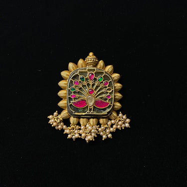 Crafted as a true heritage pendant, this piece presents a majestic peacock motif rendered in a striking blend of warm gold tone and cool, luminous silver. The peacock's splendid tail comes alive with the meticulous sparkle of kundan settings and the vibrant colors of semi-precious stones. Delicate freshwater pearls add a soft, elegant glow to the design, embodying a legacy of royal artistry and timeless grace for the modern wearer.