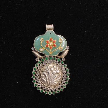 This lavish silver pendant is centered on an intricate floral motif, richly adorned with a luminous jade stone, sparkling kundan, natural corals, and other semi-precious stones. The layered floral design becomes a garden of vibrant texture and color, making it a truly opulent piece.