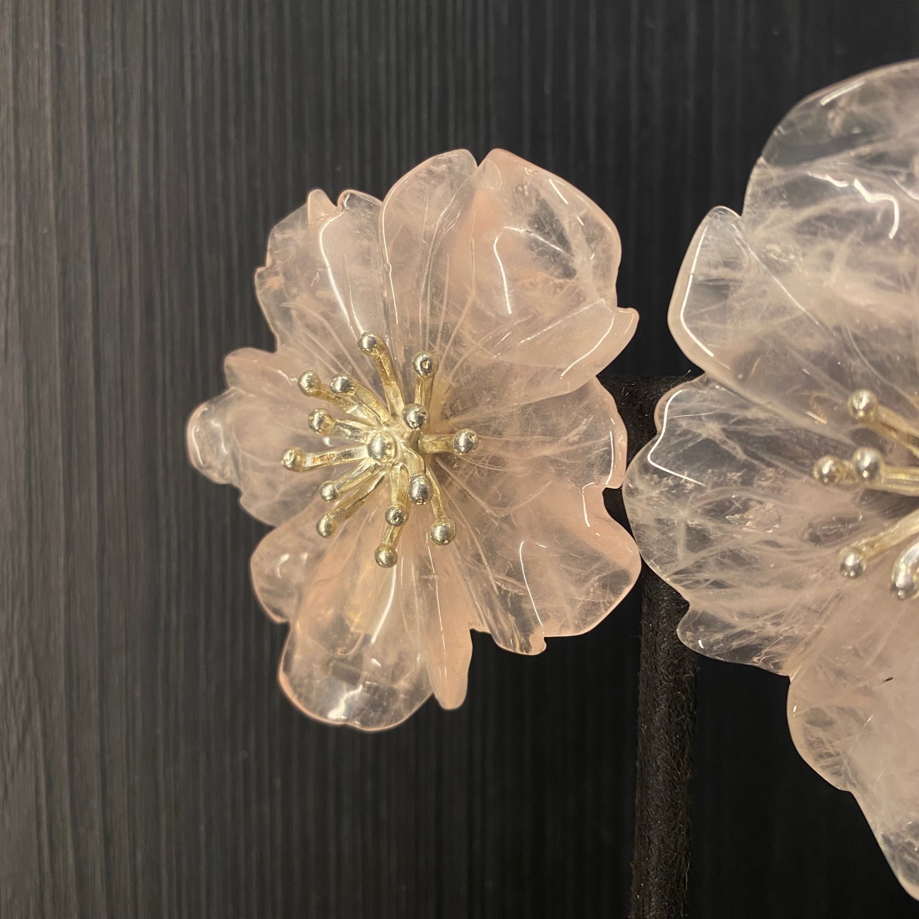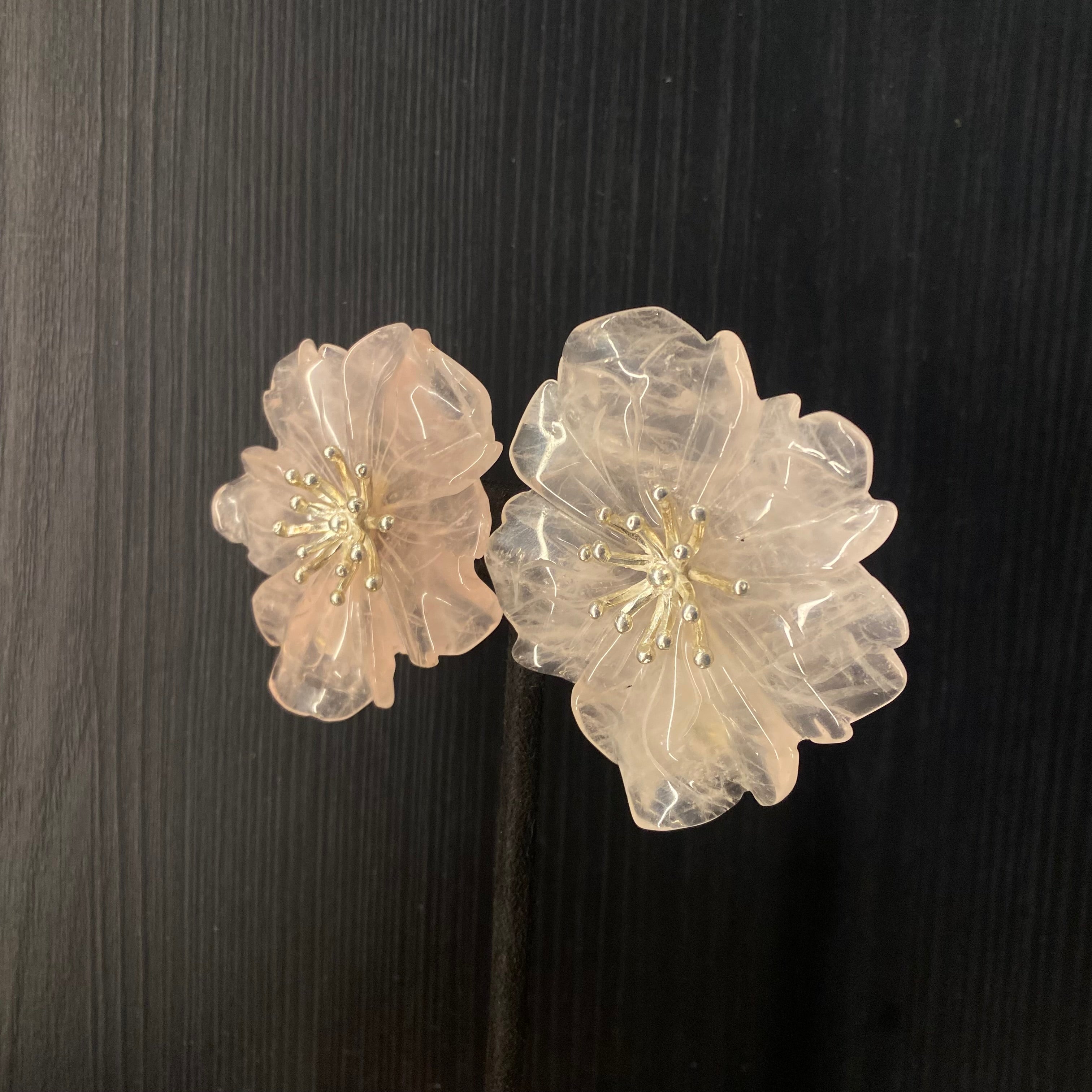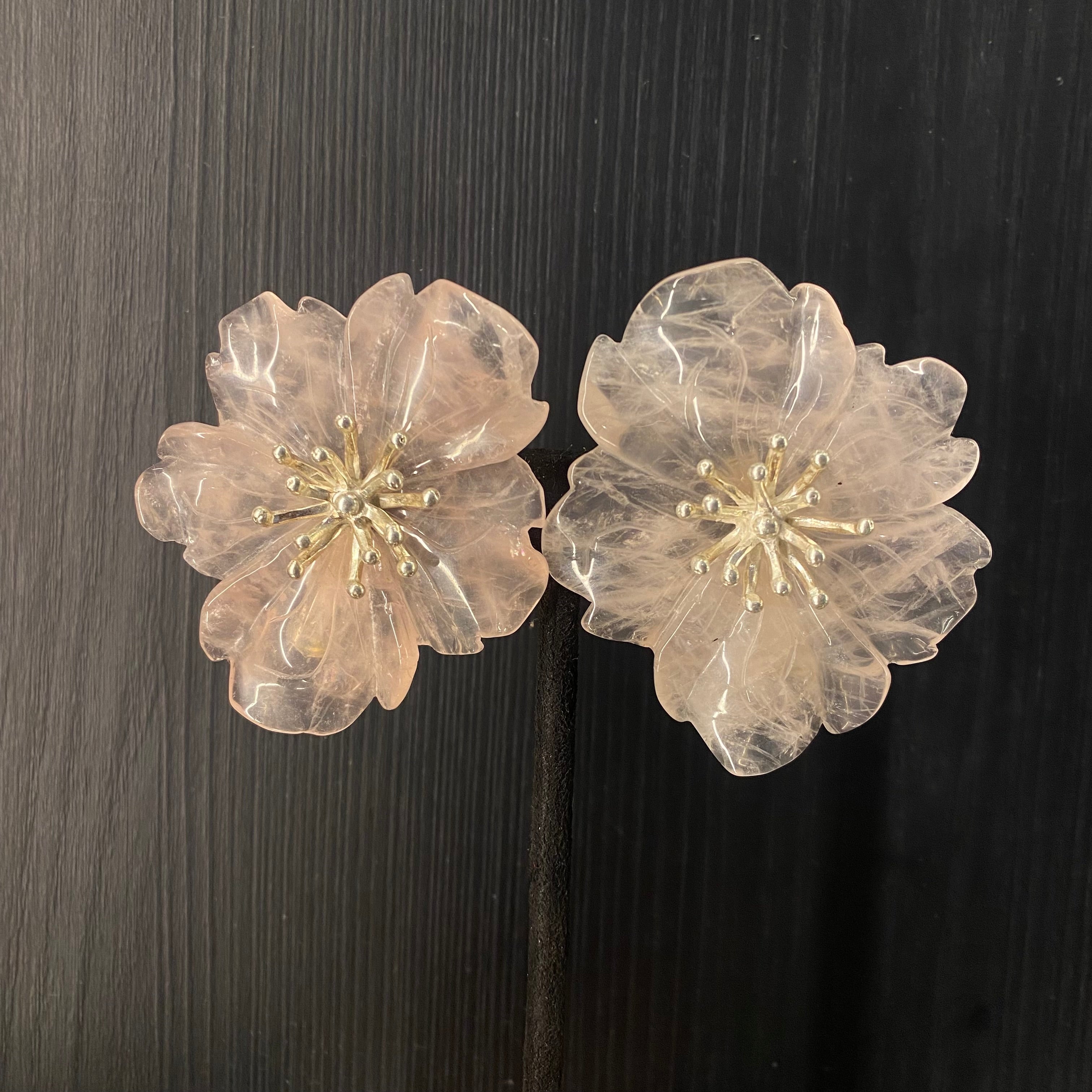 These silver earrings are a magnificent statement of sculptural beauty, designed as captivating oversize studs. They feature an intricate 3D floral motif, where each bloom is meticulously crafted with remarkable depth and dimension, creating a wearable piece of botanical art. At the heart of the silvery petals rests the soft, blushing hue of rose quartz, its gentle color adding a touch of serene romance to the bold design. This harmonious blend of dramatic size, intricate metallic form, and soothing gemstone results in a pair of statement earrings that are both powerfully modern and elegantly feminine.