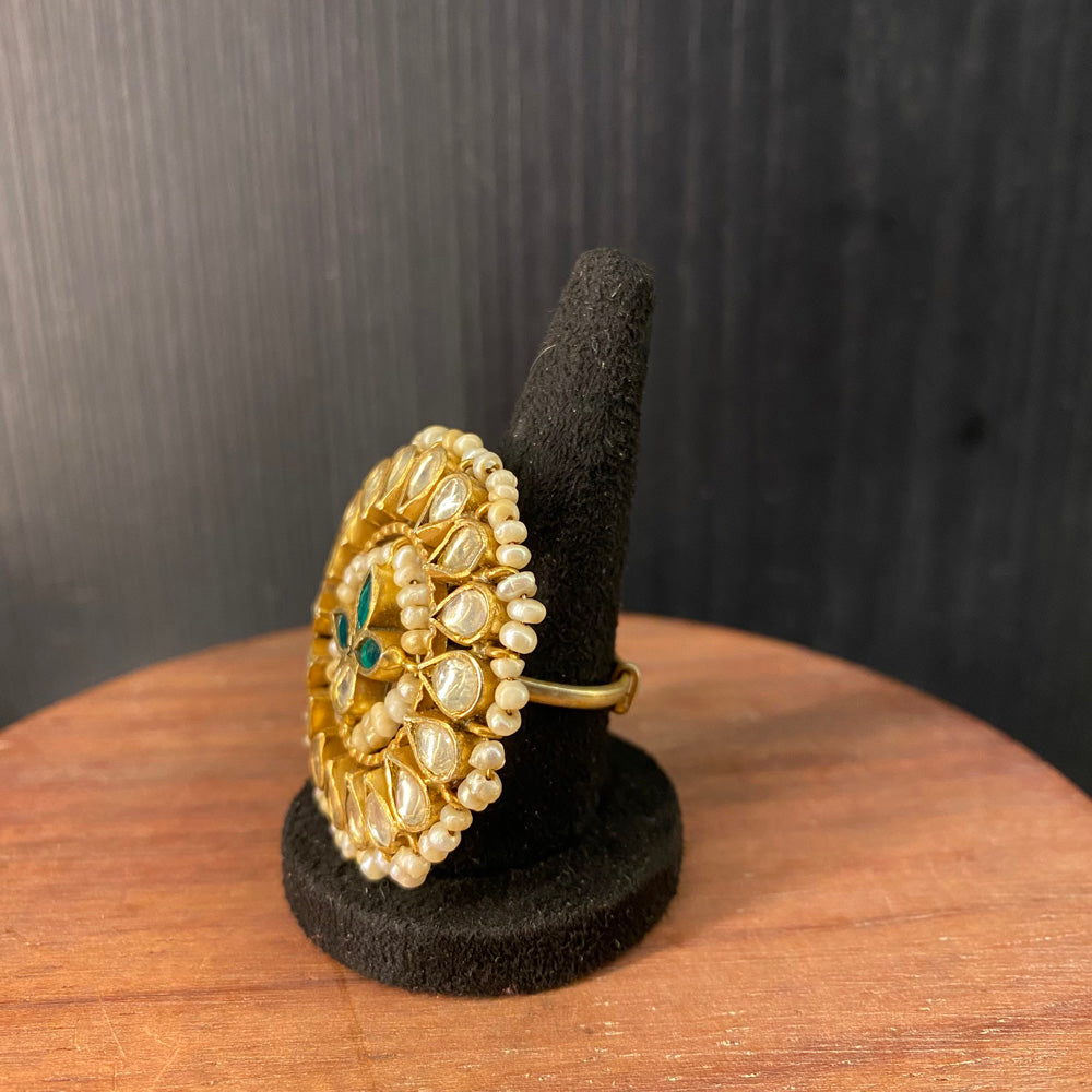 This gold tone ring features an elaborate floral motif, meticulously crafted with the traditional kundan setting. The design is studded with vibrant semi-precious stones and delicately accented with freshwater pearls, creating a rich play of color and texture. The overall opulence and detailed artistry make this piece a distinctly royal ring, perfect for grand occasions. Disclaimer: All Handcrafted Products Are Imperfectly Perfect.