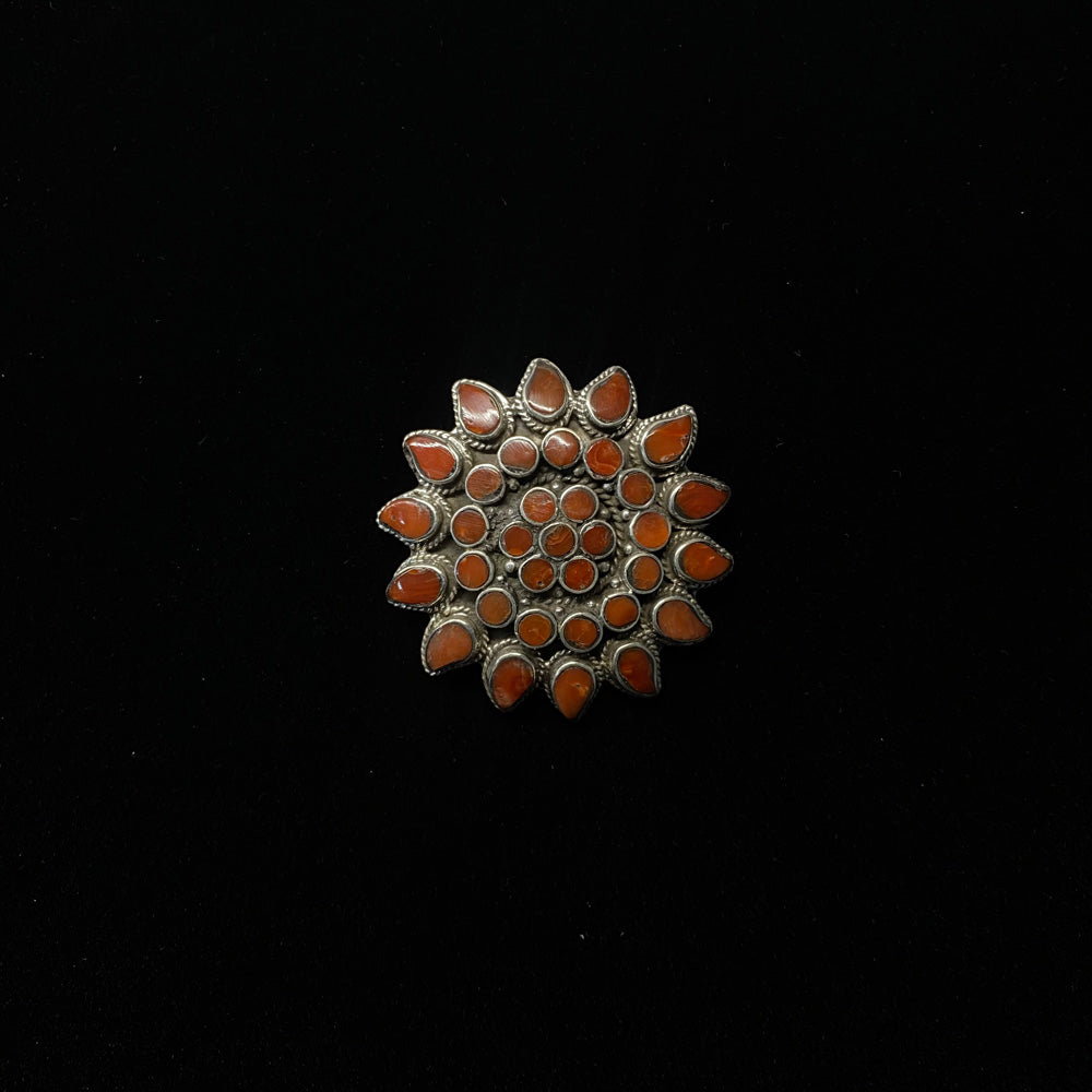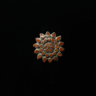 Forged with a bold tribal spirit, this silver pendant carries the raw elegance of the earth. The solid silver form is etched with a distinctive floral motif, rendered not with delicate petals, but with the powerful, organic language of tribal design. This energy is amplified by vibrant inlays of red corals, making this tribal pendant a statement of untamed beauty and ancient artistry.
