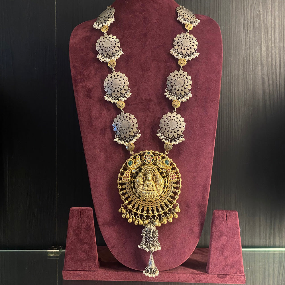 Crafted with a dual-tone finish, this exquisite silver necklace is a true testament to heritage jewellery. The centerpiece is a magnificent royal motif, intricately detailed and fit for nobility, which is gracefully complemented by an elegant goddess motif, suggesting both power and grace. Delicate pacheli designs add a layer of traditional artistry to the chain, while the gentle, melodic promise of tiny ghungroos offers a sense of movement and celebration. This long necklace, with its harmonious blend of symbols, is more than an accessory; it is a wearable piece of history and artistry.