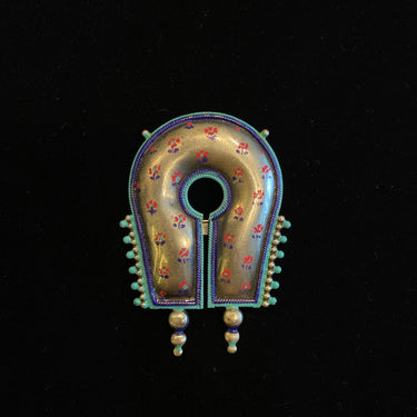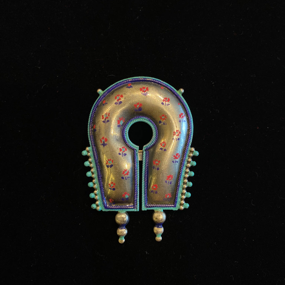 This bold silver brooch is a powerful expression of heritage, featuring a striking tribal design with intricate motifs inspired by ancient artistry. The piece is beautifully enriched with vibrant Meenakari enamel work, where radiant colors are meticulously filled into engraved patterns, creating a stunning contrast against the gleaming metal. Each geometric line and symbolic form tells a story of traditional craftsmanship and cultural pride. Designed to make a statement, this tribal brooch is a versatile accessory that adds a touch of artisanal history and contemporary edge to any look.