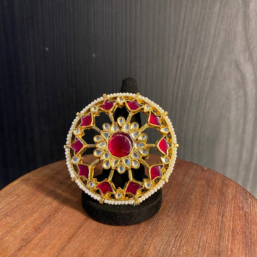 This gold tone ring is a dramatic oversize piece centered on an elaborate floral motif. The design is richly set with a vibrant red semi-precious stone using the traditional kundan technique and is delicately accented with freshwater pearls. The combination of bold color, luminous pearls, and intricate metalwork creates an opulent and truly royal ring. Disclaimer: All Handcrafted Products Are Imperfectly Perfect.