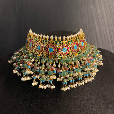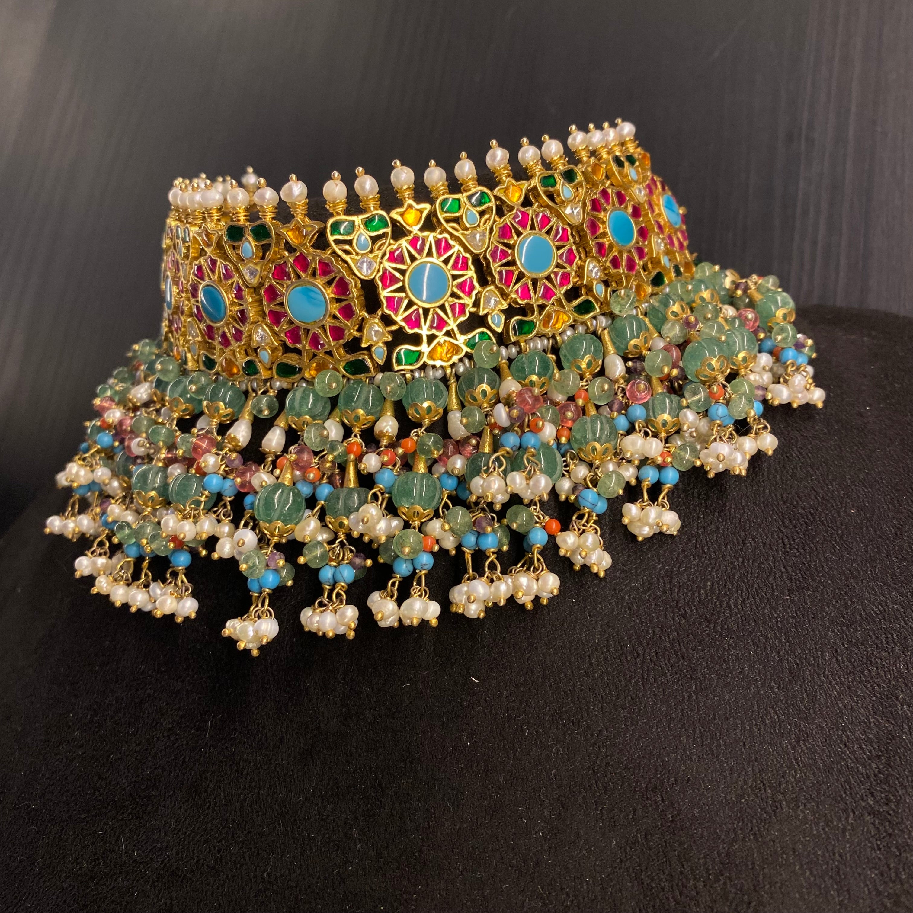 This opulent gold tone choker is a true masterpiece of heritage jewellery, designed with the commanding presence of a royal choker. It centers on an exquisite floral motif, brought to life through the vibrant artistry of meenakari enamel work and the radiant sparkle of set kundan. Rich turquoise stones and accents of other semi-precious gems provide a striking contrast, while graceful strands of freshwater pearls drape elegantly, adding a layer of soft, timeless luxury. Every detail converges to create a piece of heirloom quality, celebrating a legacy of unparalleled craftsmanship.