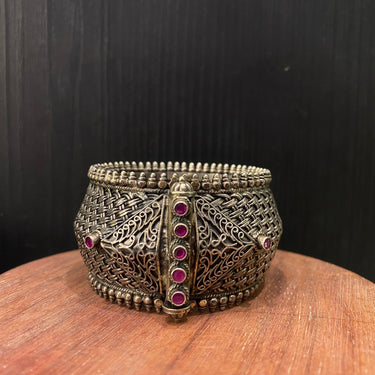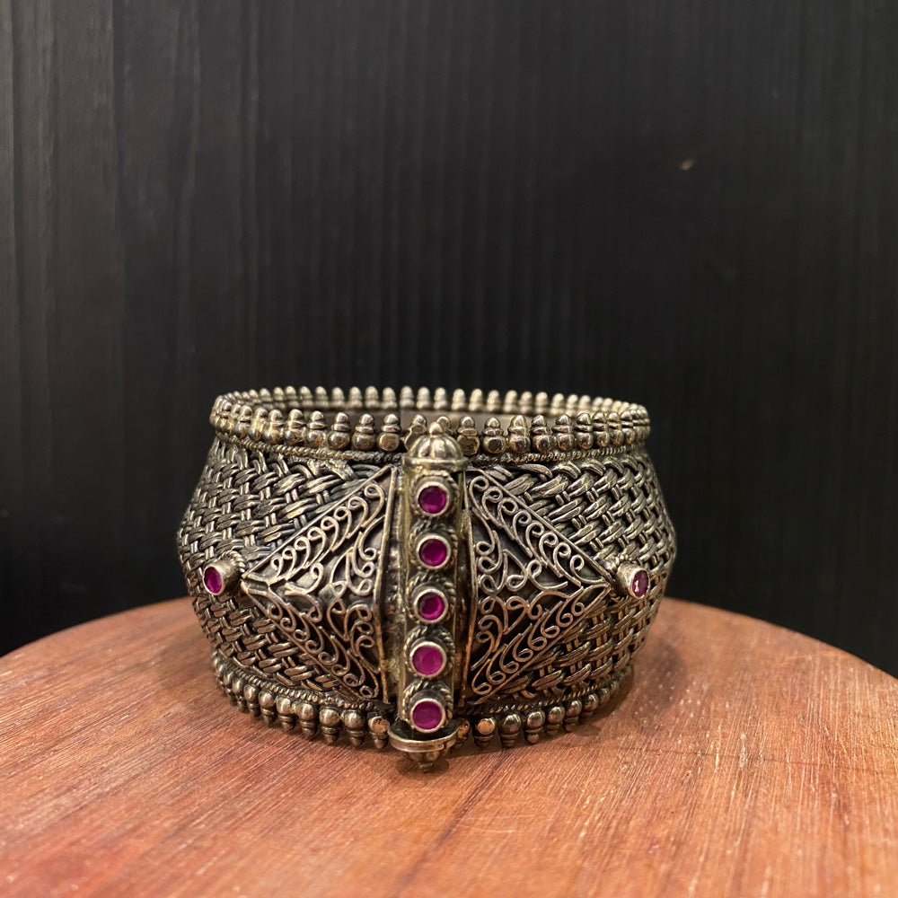 This substantial silver kada is a statement piece of vintage jewellery, crafted from pure, gleaming silver. Its solid form as a classic silver bangle showcases an intricate vintage design, where each curve and etching tells a story of timeless artistry. The look is beautifully punctuated by the soft, romantic glow of a pink semi-precious stone, adding a touch of delicate color to the piece's enduring strength. Wearing this vintage kada is to carry a fragment of history, reimagined for a modern wrist.