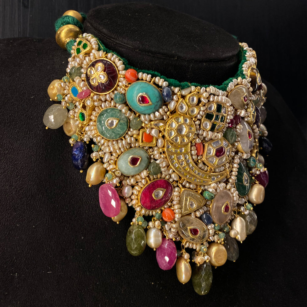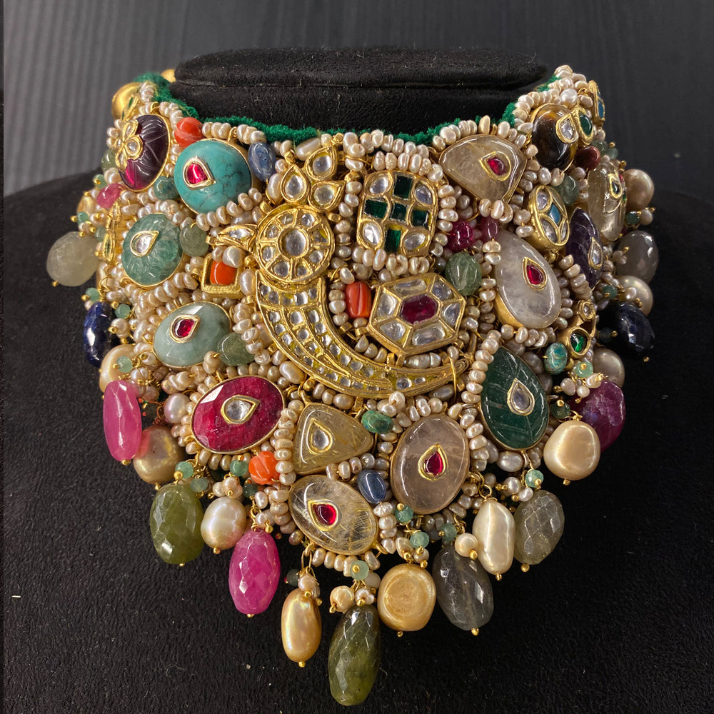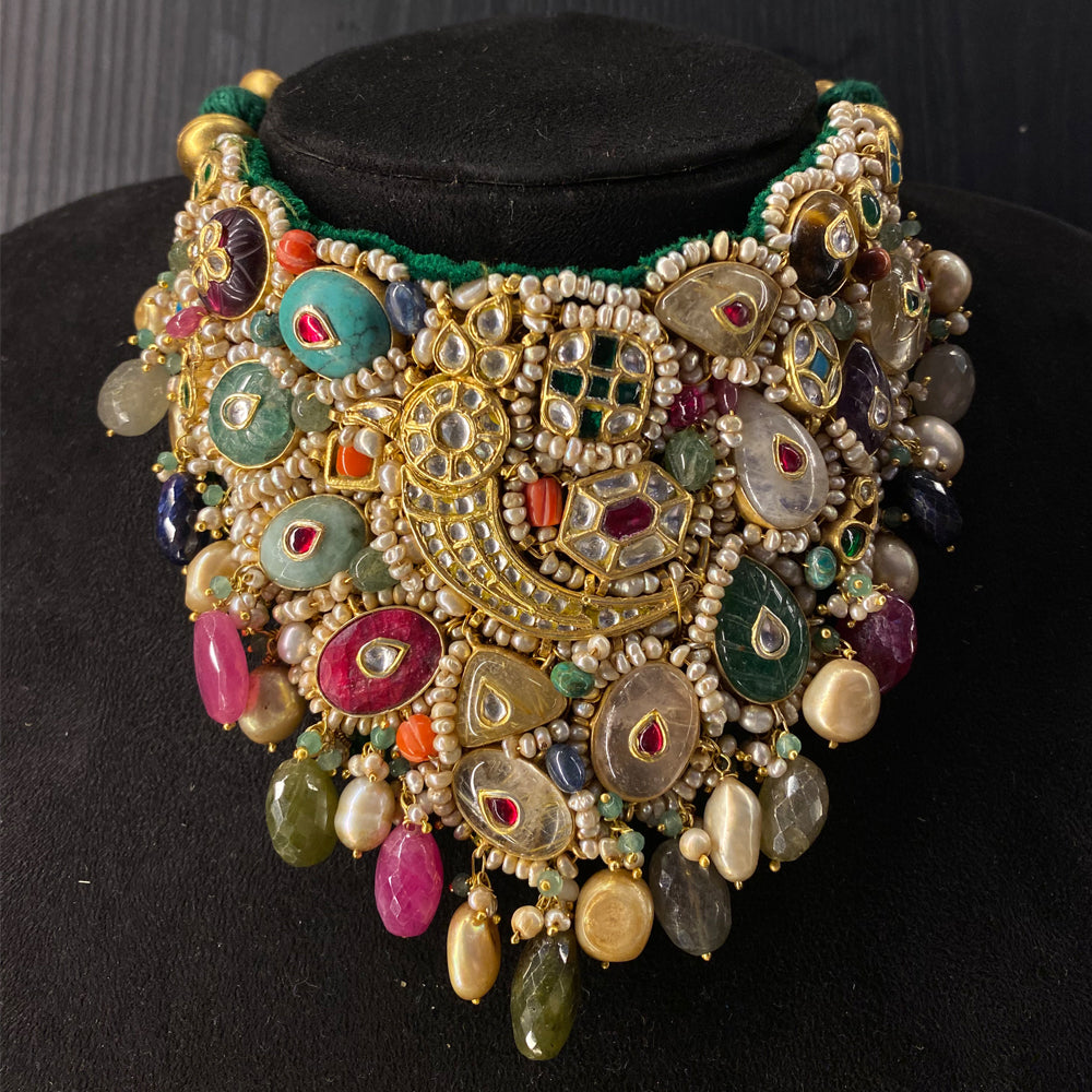 This gold tone and silver necklace is a heritage necklace that celebrates timeless artistry and craftsmanship. Adorned with intricate motifs, the design is brought to life with luminous freshwater pearls, radiant kundan, and carefully chosen semi-precious stones. Crafted in a cluster necklace style, it exudes elegance and grandeur, making it a statement piece that bridges tradition with contemporary allure.Disclaimer: All Handcrafted Products Are Imperfectly Perfect.
