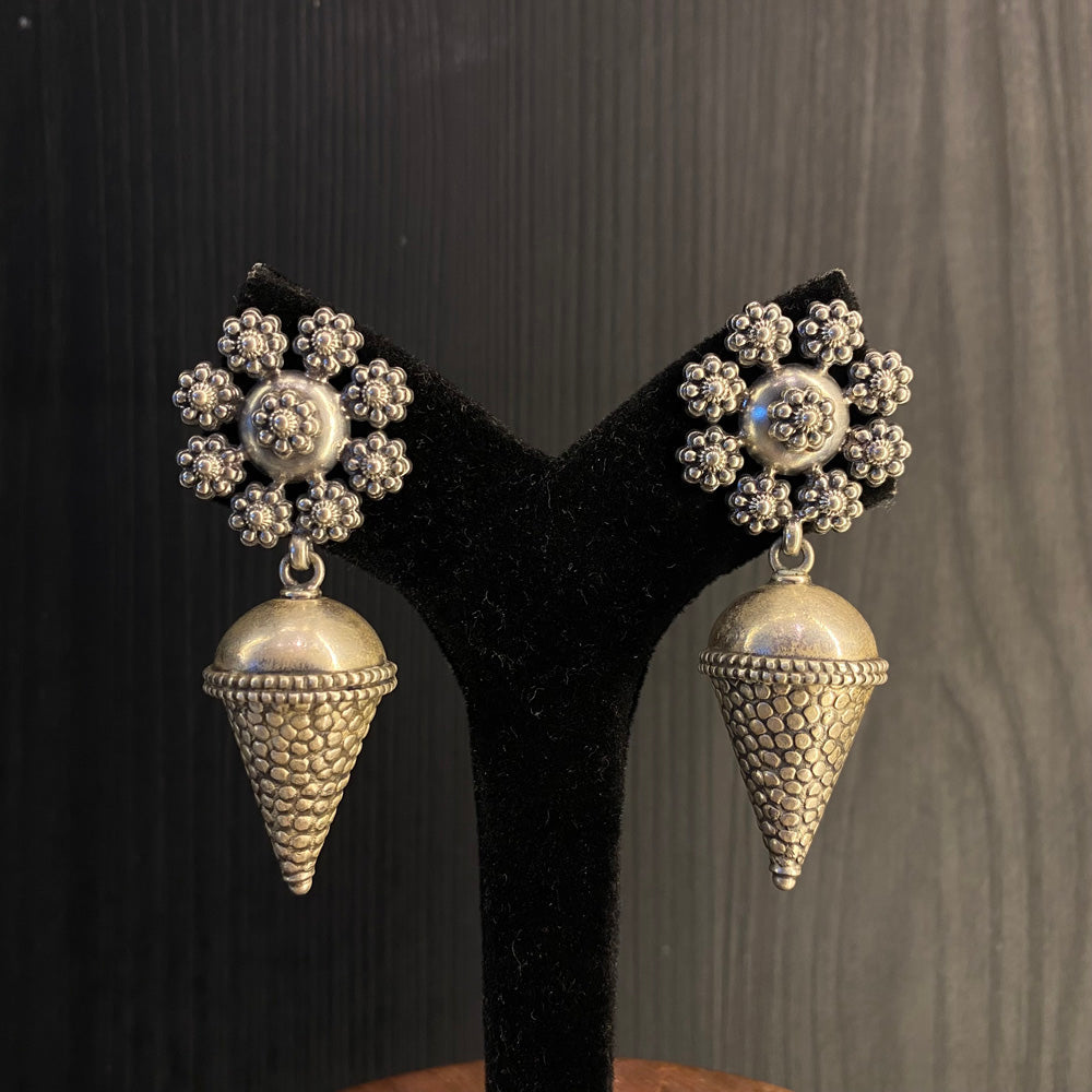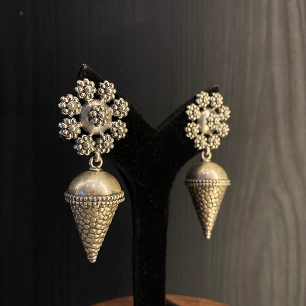 These striking tribal jewellery pieces are crafted entirely in silver, featuring a bold, conical shape that tapers elegantly from the lobe. The surface of each cone is intricately etched with a repeating floral motif, artfully blending organic inspiration with a powerful, geometric form. For a look of earthy sophistication, pair these earrings with a simple handloom saree or a raw silk kurta, allowing their unique texture and sculptural silhouette to make a definitive statement. All Handcrafted Products Are Imperfectly Perfect.