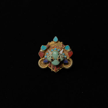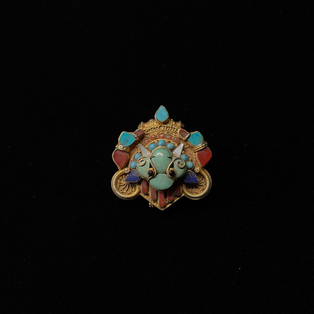This distinctive piece of tribal jewellery masterfully blends a warm gold tone with the cool sheen of silver in a single pendant. Its powerful tribal design, etched with an old-world charm, is richly adorned with vibrant turquoise stone, deep red corals, and an array of other semi-precious stones. The result is a bold silver pendant that carries the spirit of ancient artistry, making a timeless and earthy statement.