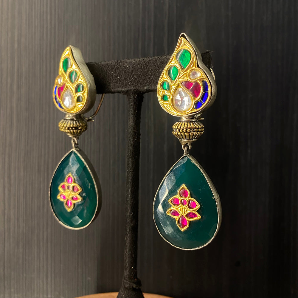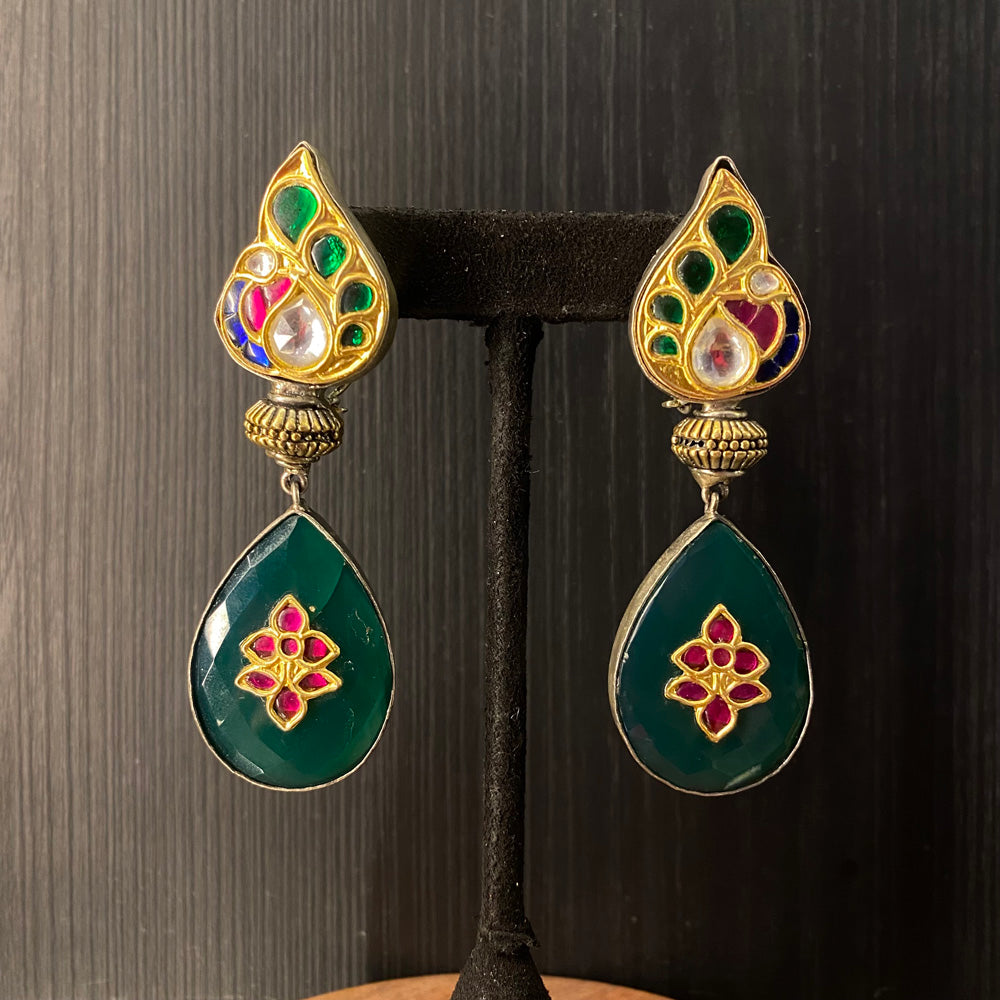 These stunning earrings showcase a beautiful dual-tone design, masterfully blending silver with a contrasting metallic hue. Each piece is centered around an intricate peacock motif, meticulously crafted with shimmering kundan stones. From the regal bird's form descends a graceful emerald drop, adding a touch of vibrant color. The entire design is delicately framed and accented with smaller floral motifs, creating a piece that is both elaborately detailed and elegantly balanced.Disclaimer: All Handcrafted Products Are Imperfectly Perfect.