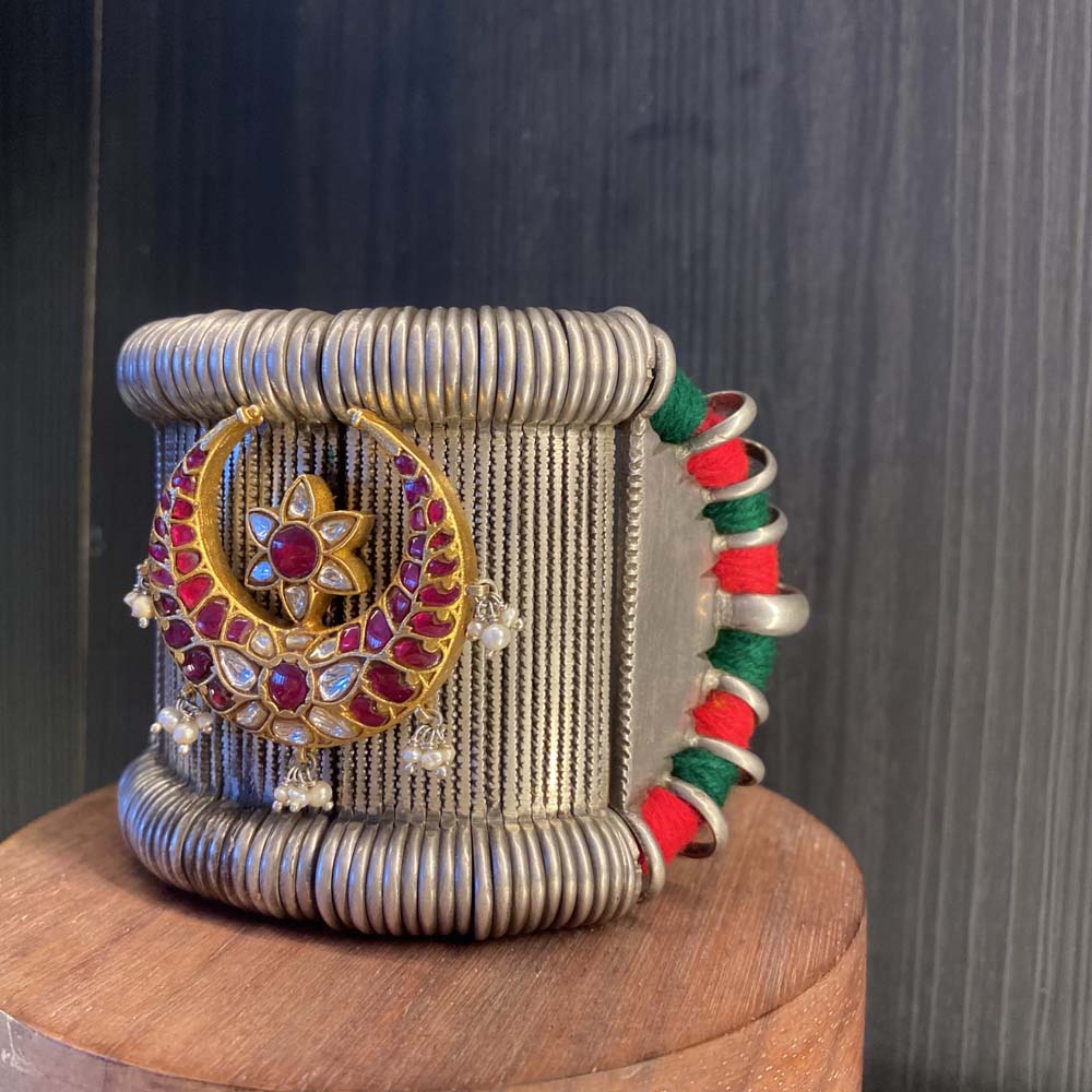 This dual tone silver bracelet, designed in the form of a silver kada, is a radiant piece of traditional jewellery. Embellished with an elegant moon motif and intricate floral motifs, it captures both symbolism and artistry. Accented with soft pink semi-precious stones and lustrous freshwater pearls, the piece balances heritage detailing with timeless grace, making it a versatile treasure for any collection.Disclaimer: All Handcrafted Products Are Imperfectly Perfect.