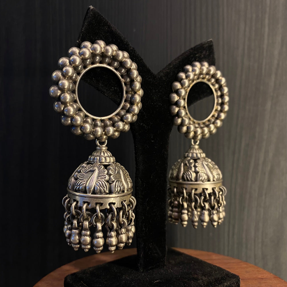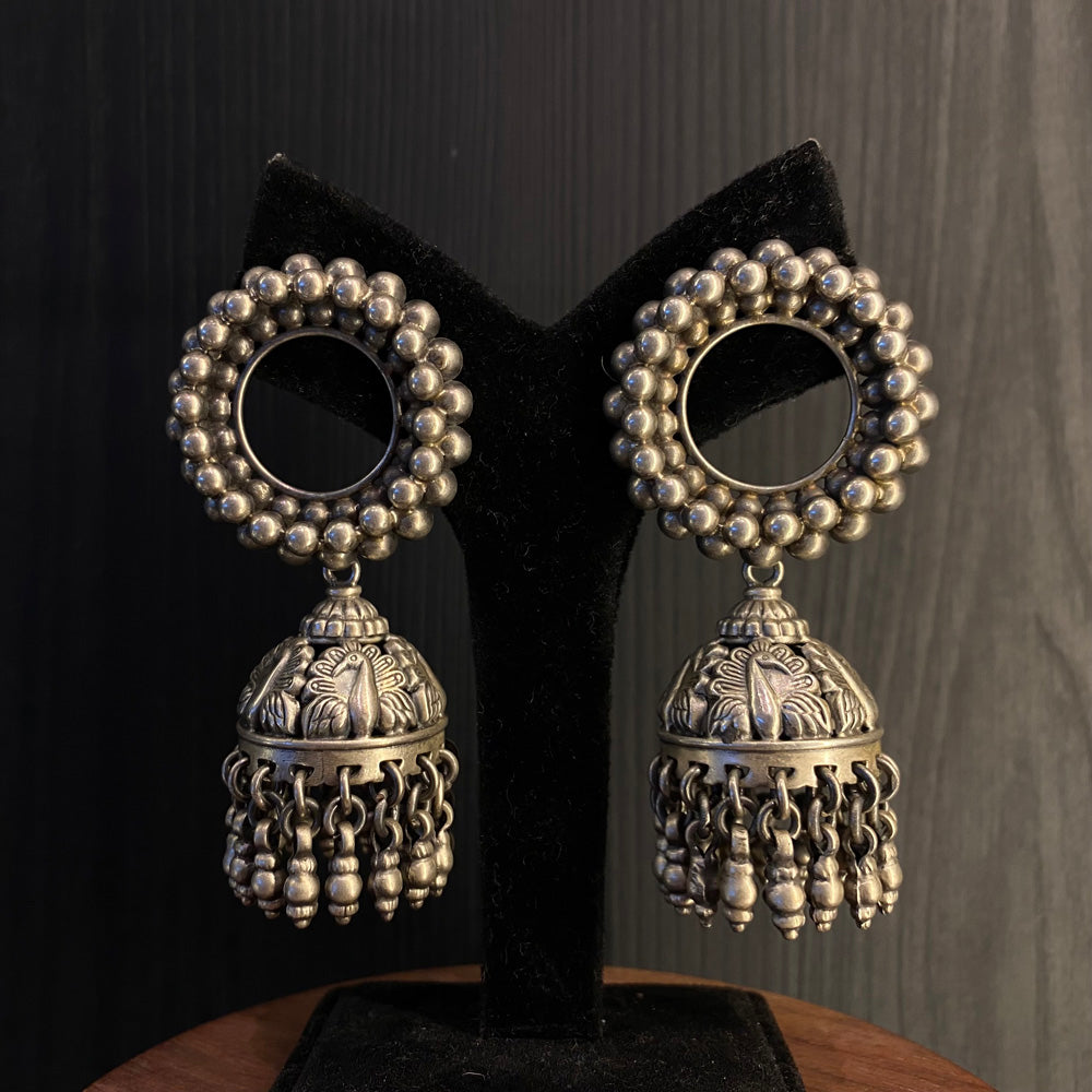 This exquisite piece of vintage jewellery reimagines the classic jhumki in polished silver, featuring a prominent circular motif from which a delicate cascade of tiny silver ghungroos is suspended, creating a soft, melodious chime with every movement. For a touch of timeless grace, pair these earrings with a flowing chiffon sari or an embroidered Anarkali suit, allowing their elegant motion and nostalgic charm to beautifully complement the fluidity of your traditional attire. All Handcrafted Products Are Imperfectly Perfect.