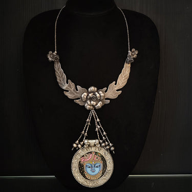 This dual tone silver necklace is a heritage neckpiece that embodies art and devotion. Centered around an exquisite Shrinath Ji painting, it is framed by intricate floral motifs and lifelike 3D florals that add sculptural depth. Accented with the elegance of a peacock motif, the design radiates timeless grace and cultural richness, making it a true masterpiece of heritage jewellery.Disclaimer: All Handcrafted Products Are Imperfectly Perfect.