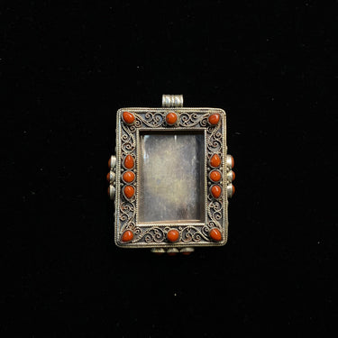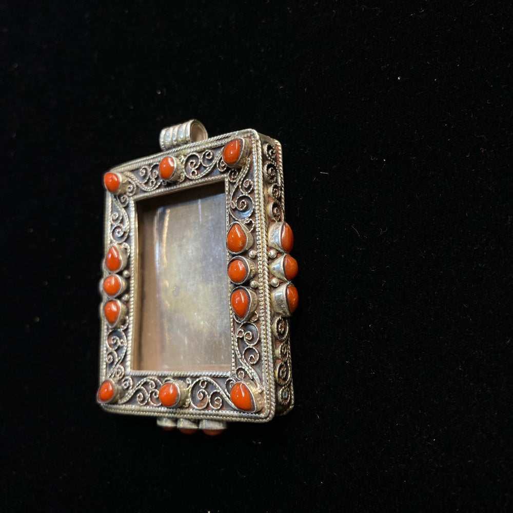 This bold frame pendant, a definitive piece of both tribal and boho jewellery, is crafted in silver and adorned with rich, natural corals. The combination creates a striking silver pendant that is both earthy and artistically expressive.