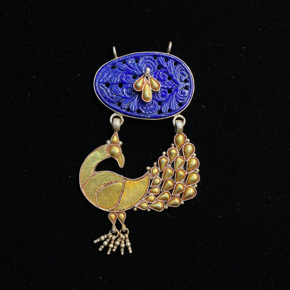 This opulent heritage pendant centers on an intricate peacock motif, artfully rendered in a dual tone finish. The majestic design is further accentuated by the deep blue of a polished lapis stone, creating a piece that is both regal and deeply rooted in tradition.